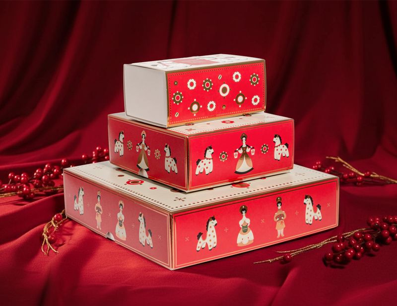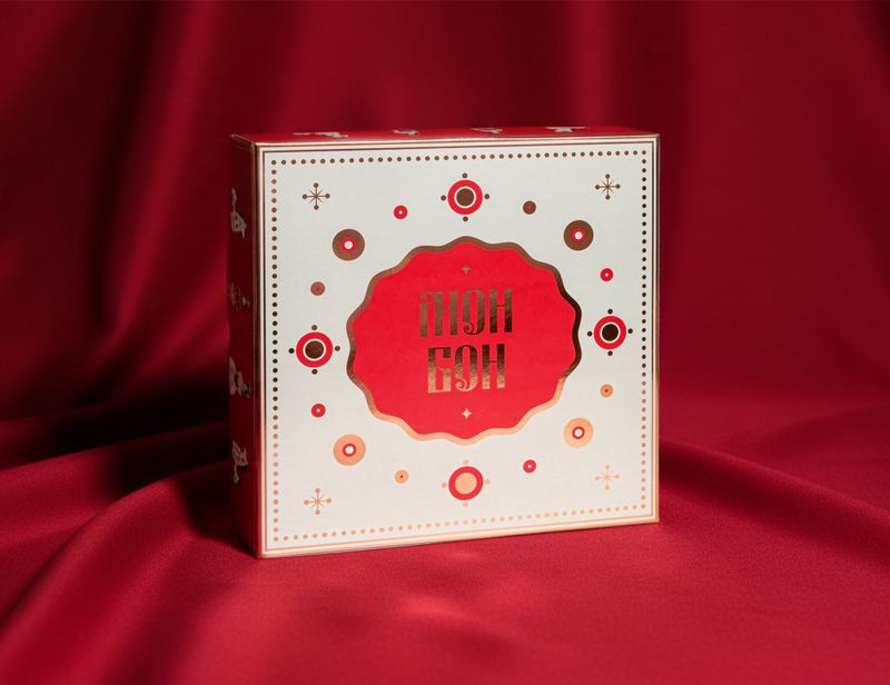 Коробка украшена праздничным узором в духе дымковской росписи с золотым тиснением, как настоящая подарочная шкатулка.