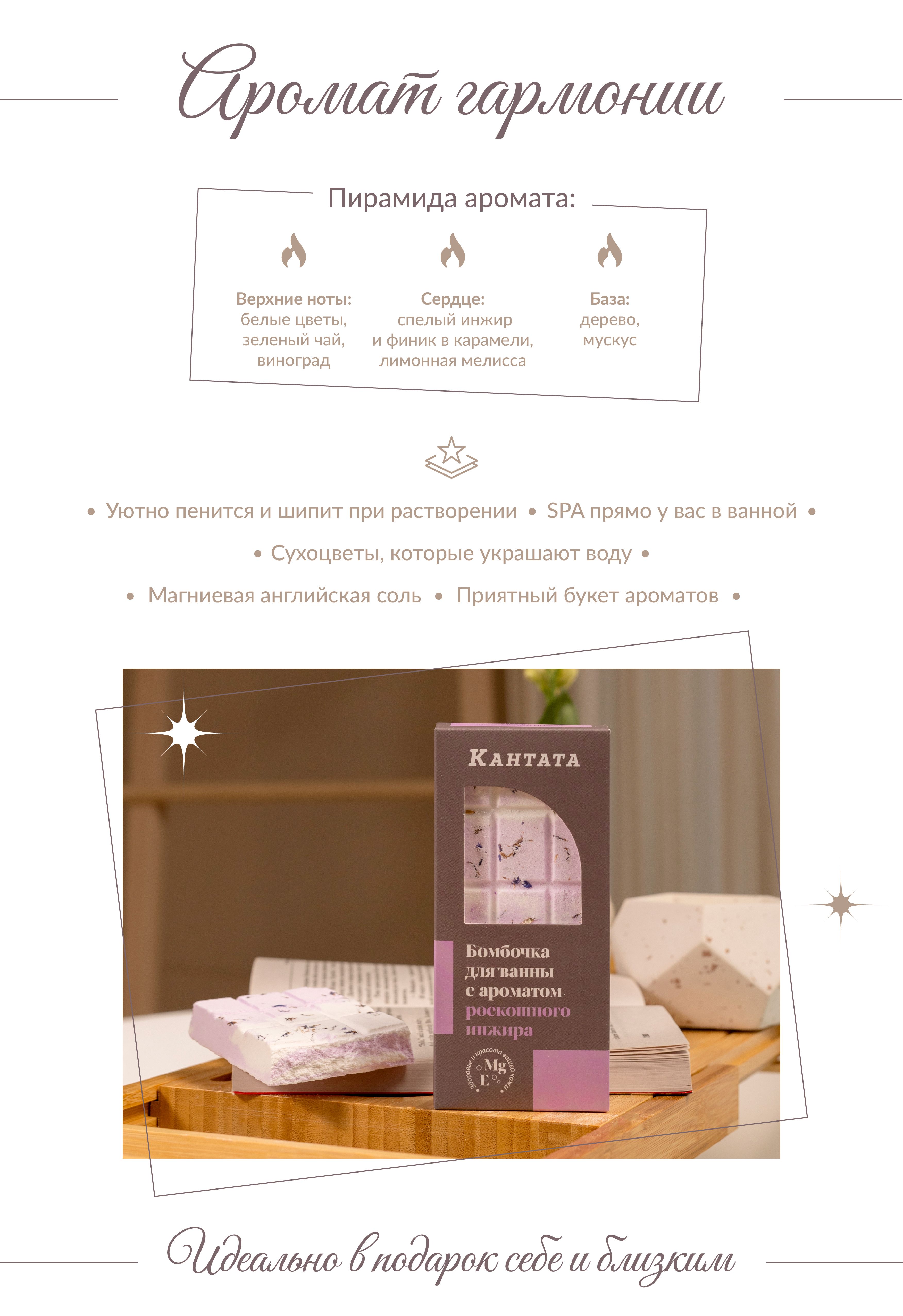 SPA-процедура прямо в ванной! Порционная плитка английской магниевой соли наполнит вашу ванную комнату тонкими цветочно-фруктовыми нотами флердоранжа, мускатного винограда и сахарного инжира.