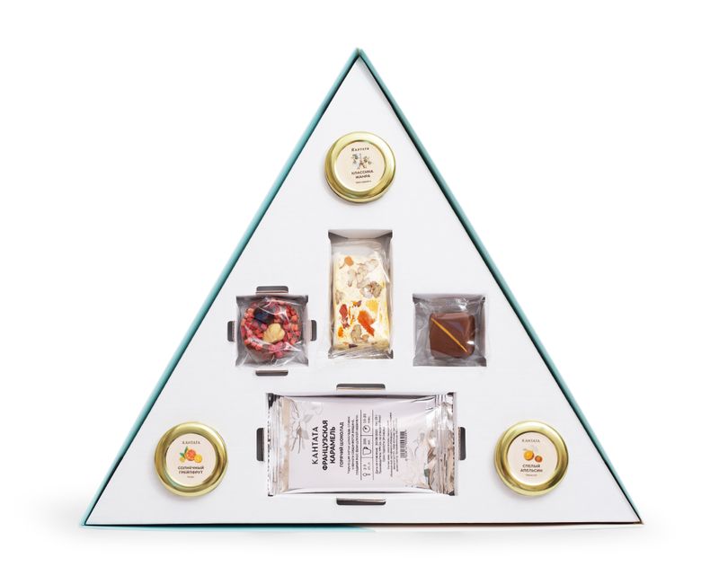 1) Обливная конфета «Аврора», шоколадная конфета глазированная молочным шоколадом с комбинированными конфетными массами на основе марципана, фисташковой пасты, дробленой фисташки и молочного шоколада, миндального пралине, ореховой пасты из миндаля в молочном шоколаде, 14 г. Состав: марципан (миндаль очищенный (48%), сахар, инвертный сахарный сироп, вода, консервант: этиловый спирт), молочный шоколад (тростниковый сахар, какао-масло, какао тертое, сухое цельное молоко, эмульгатор: соевый лецитин; натуральный ароматизатор: ваниль), ореховая паста из миндаля, миндаль жареный цельный, сахар, ореховая паста из фисташки, фисташка обжаренная дробленая, какао-масло, вода, гималайская розовая соль, спирт, блеск пищевой (алюмосиликат калия, диоксид железа, оксид железа).