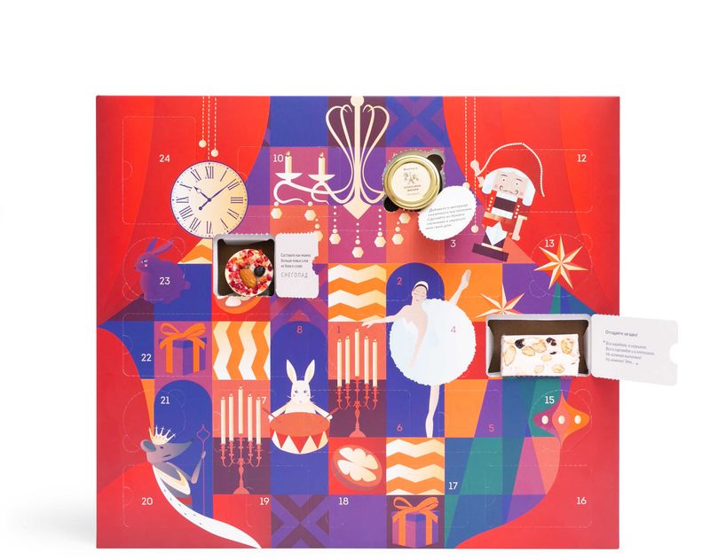 За каждым окошком вы найдёте незабываемую палитру вкуса и приятное пожелание. В календаре мы собрали самые яркие сочетания вкусов — бестселлеры и новогодние новинки. Двадцать четыре лакомства — двадцать четыре момента удовольствия!