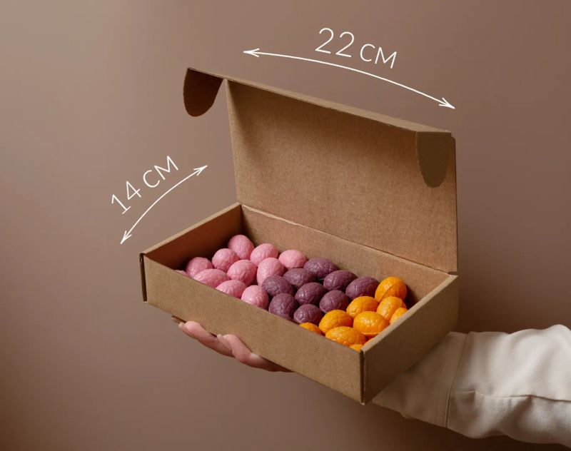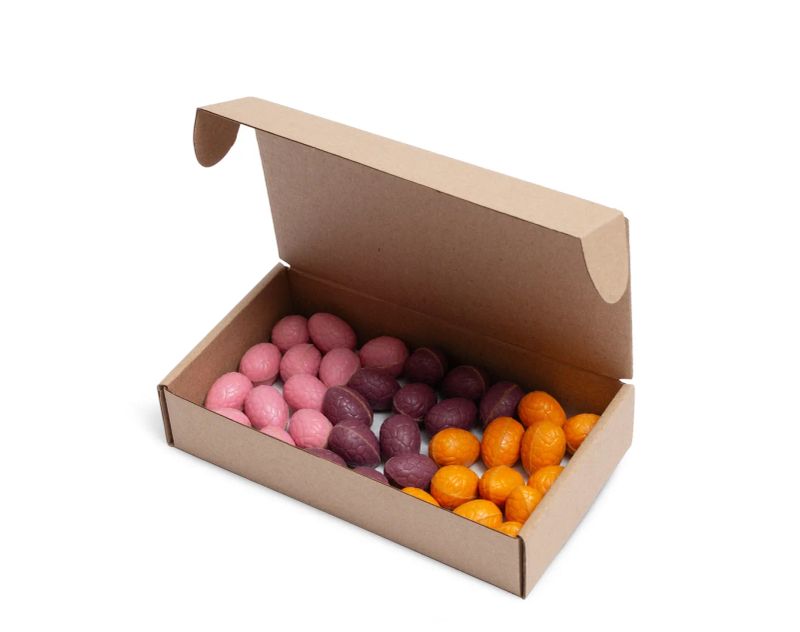 Фиолетовые яйца из авторского шоколада «Черная смородина и мята» заполнены молочным шоколадом, фундучной пастой, шариками воздушного риса. Оранжевый цвет шоколадного десерта пленяет нежными нотками апельсина и тающей текстурой миндальной пасты, рисовыми шариками. Шоколадные яйца розового цвета изготовлены из клубничного шоколада, миндальной пасты, сублимированной клубники и рисовыми шариками.