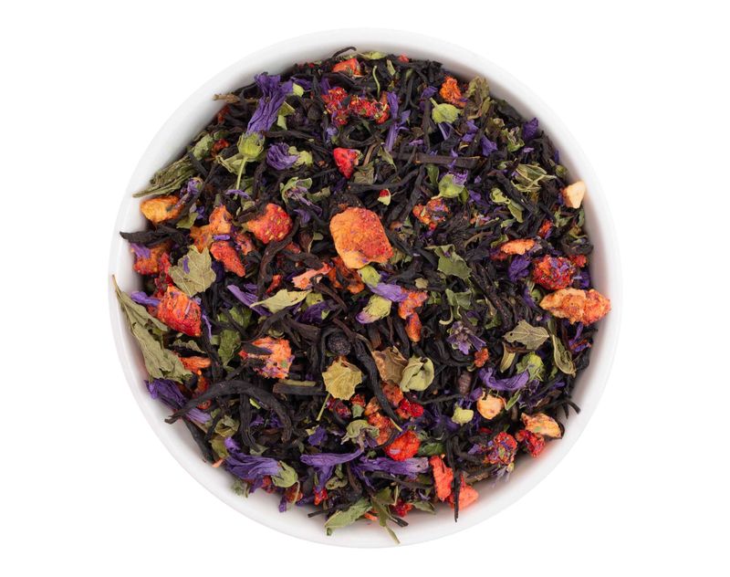 Состав: черный чай Ассам, сублимированные ягоды клубники, ягоды черники, цветы мальвы, листья мелиссы, натуральный ароматизатор.