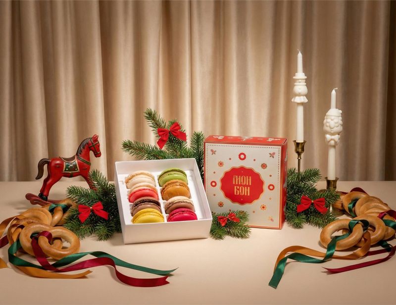 Внутри 8 пирожных макаронов из классической линейки Mon Bon: любимые вкусы, новогодние цвета и безупречная текстура. Это ассорти словно собрано из разных глав зимней сказки, для тех, кто любит удивляться и угощать.