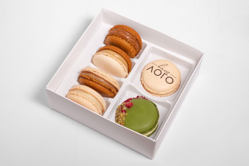 6 пирожных в упаковке из белого картона, 1 нанесение логотипа или любого другого изображения и бирка с вашим логотипом.