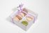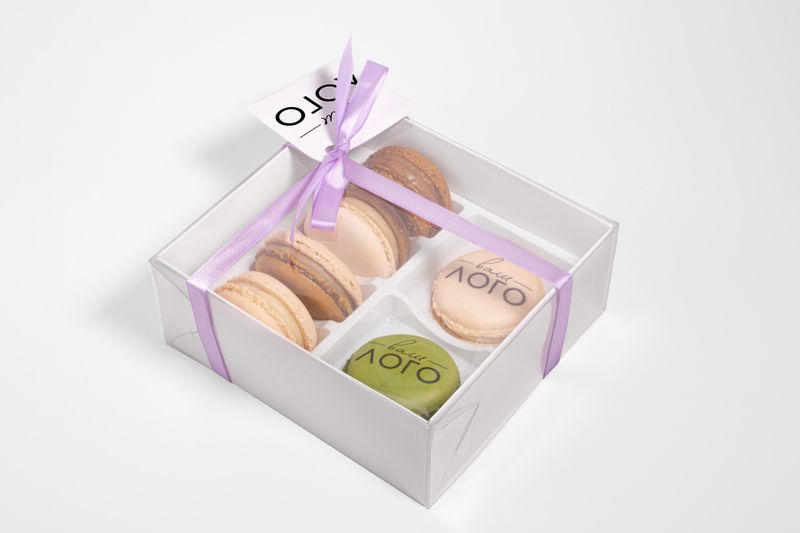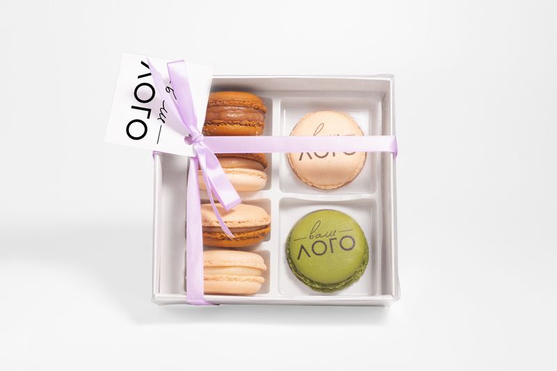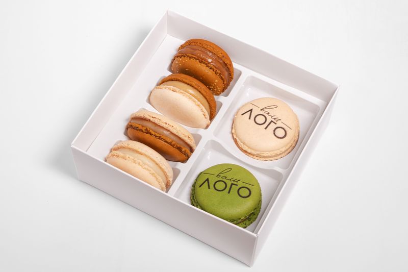 6 пирожных в упаковке из белого картона, 2 нанесение логотипа или любого другого изображения и бирка с вашим логотипом.