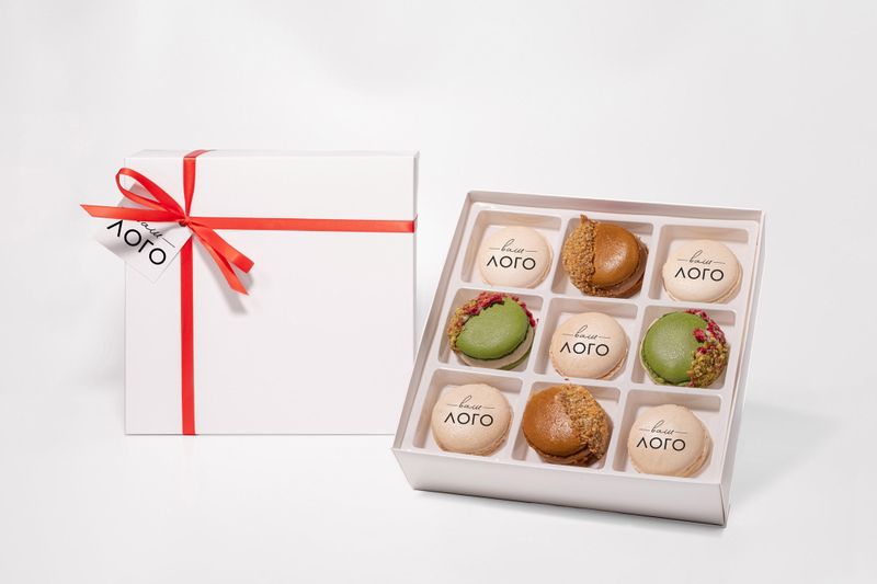 9 пирожных в качественной белой коробке, 5 нанесений логотипа или любого изображения на пирожное и бирка с вашим логотипом.
