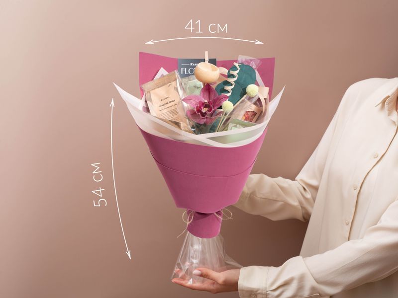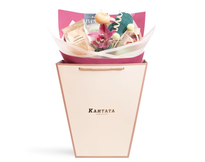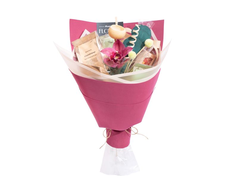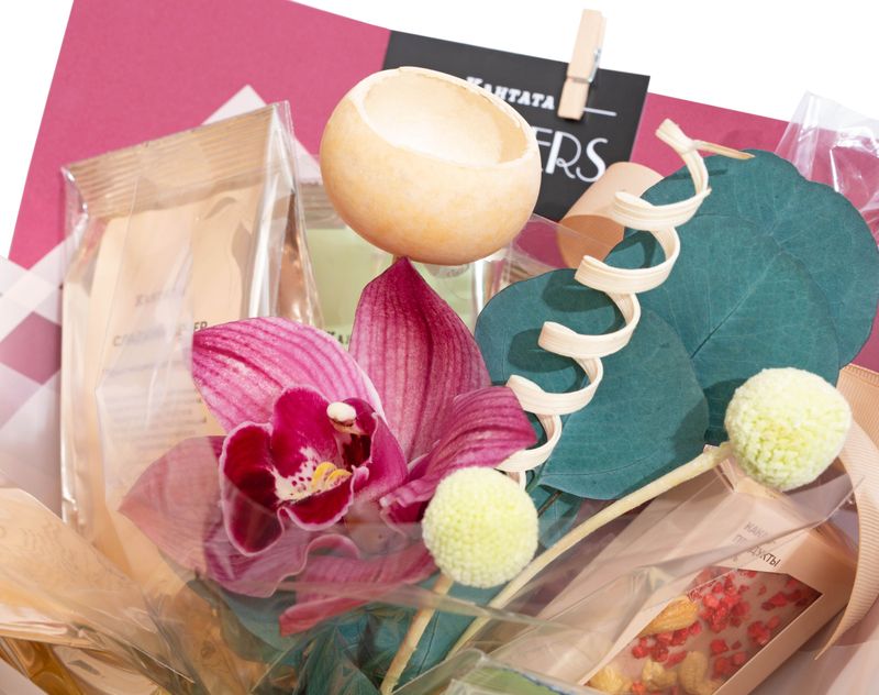 Изысканный букет, центром которого стала великолепная орхидея! Вокруг — пять сортов чая, классики и душистых купажей на любой вкус, а также два десерта ручной работы: белый шоколад с кешью и клубникой и редкий рубиновый шоколад.