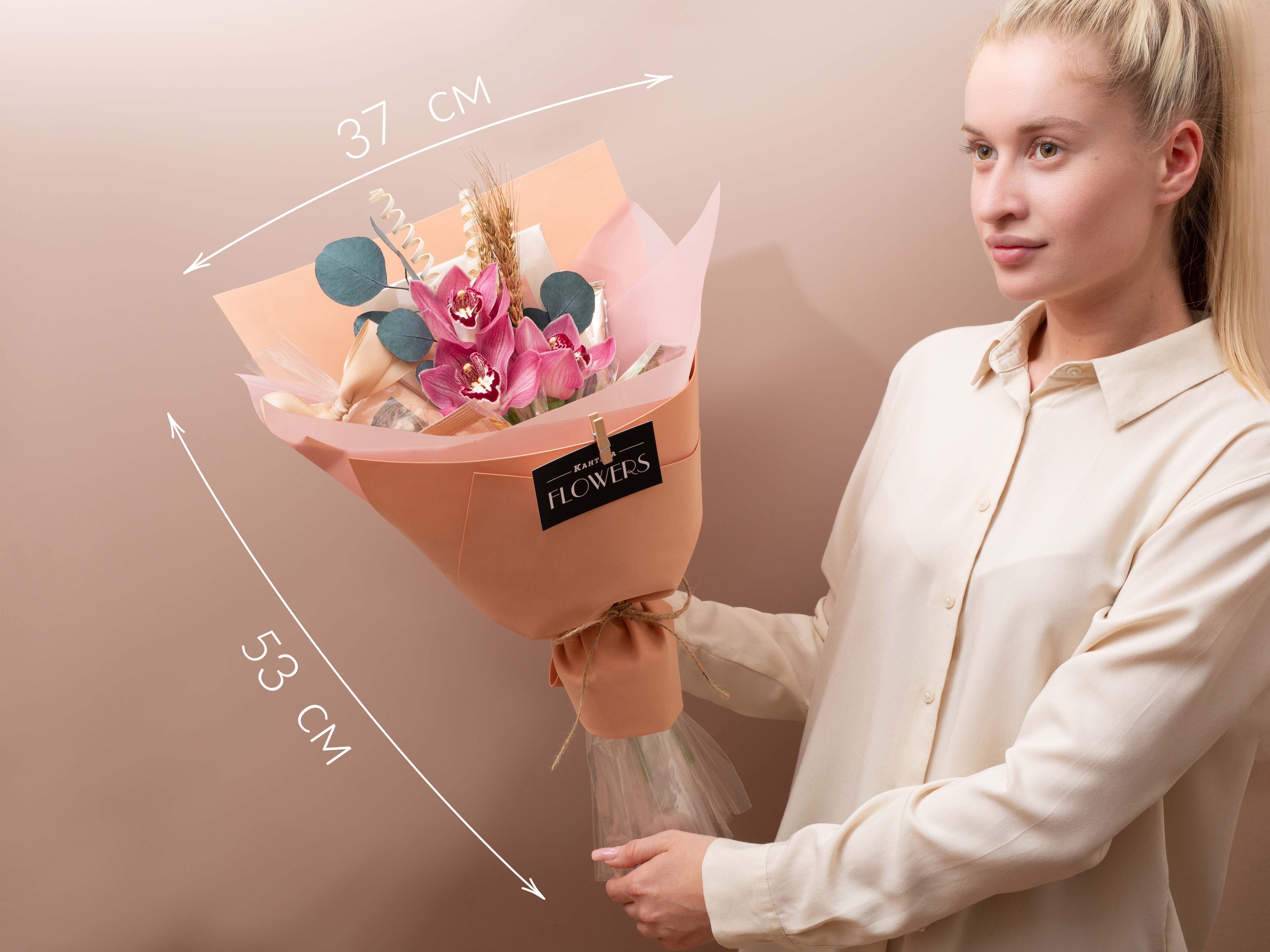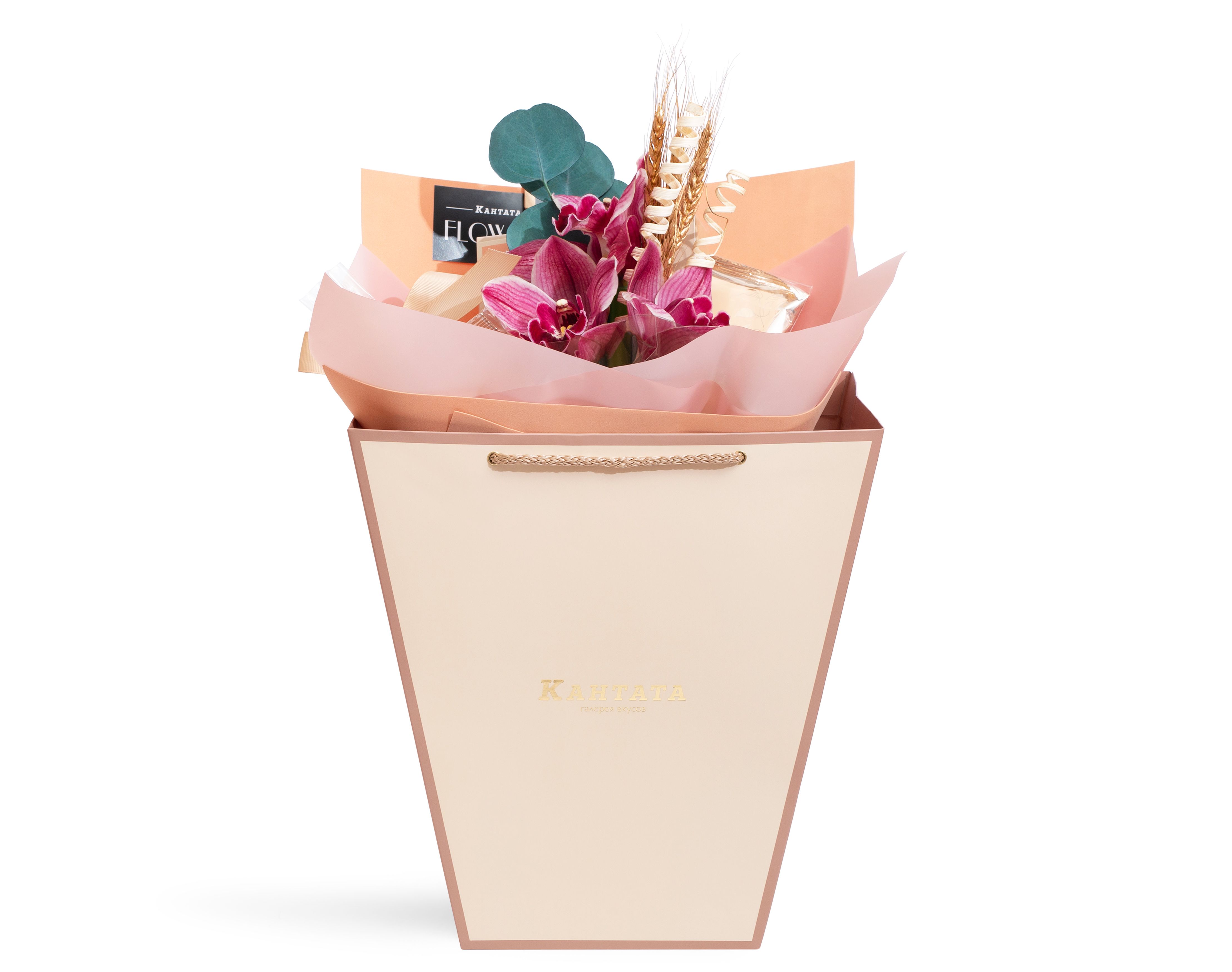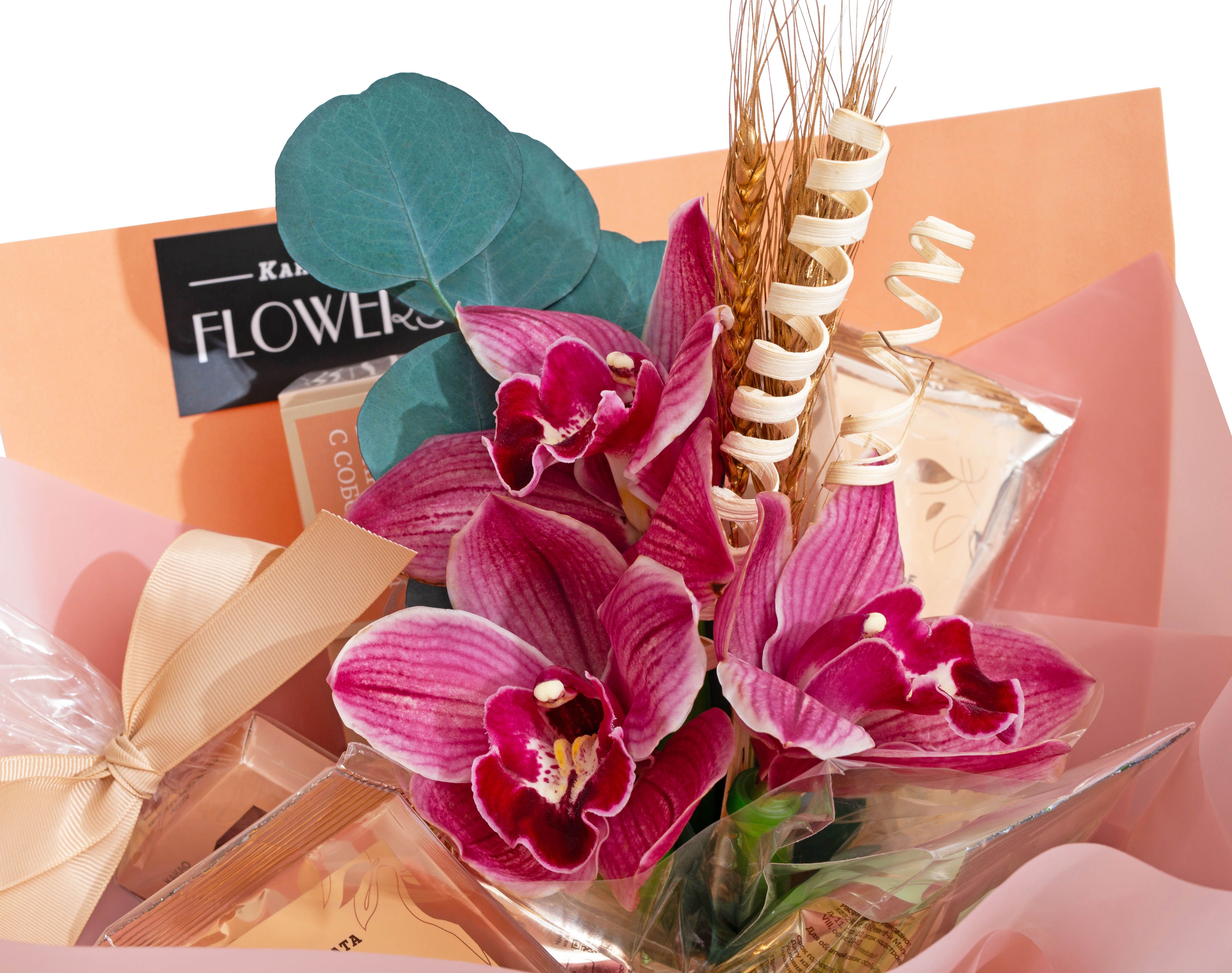 Сердце этого букета — великолепные пурпурные орхидеи и изумрудные листочки эвкалипта. Вокруг — шесть согревающих напитков: чай и кофе классических и десертных сортов, которые обеспечат яркое разнообразие в чашке. На десерт — шелковистый авторский шоколад с черной смородиной и мятой, чтобы было еще вкуснее.