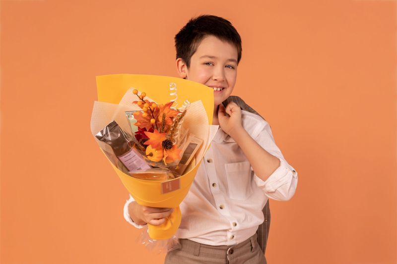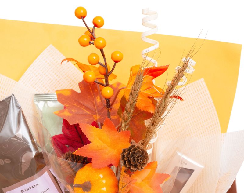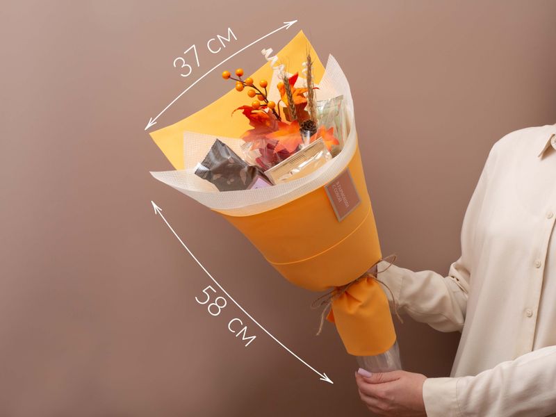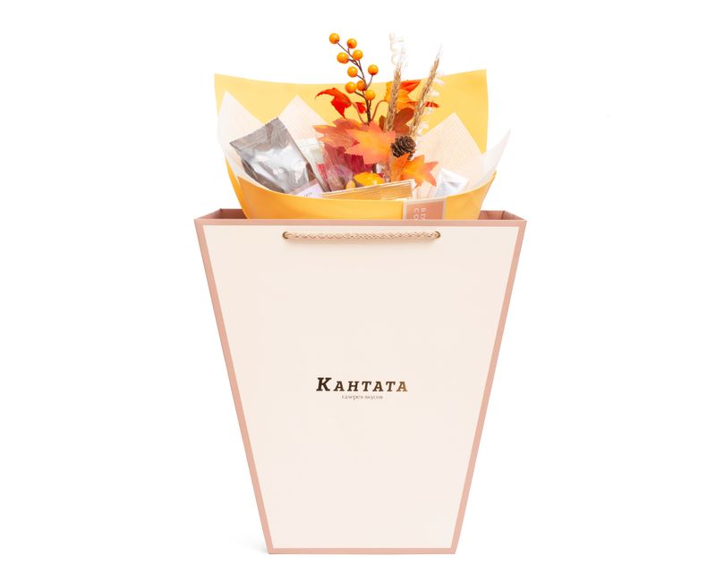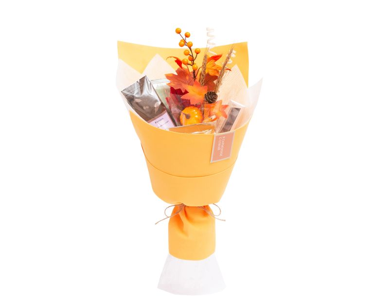 Яркий подарок на важный праздник! Внутри — классический индийский чай Ассам Митхас Амчонг с душистыми медовыми нотами, черный чай «Королевские сливки» с нежным ванильным ароматом и «Имбирный лимонад» — яркий зеленый чай с пестрым характером. Также в букет мы вложили кофе — сорт «Банановый Сплит», похожий своим звучанием на знаменитый десерт. Плитка молочного шоколада прекрасно дополнит вкусы согревающих напитков.