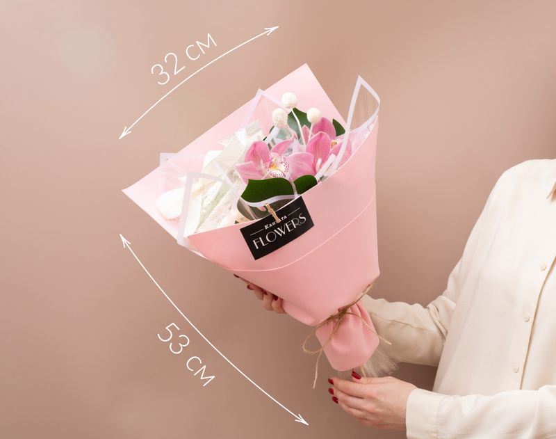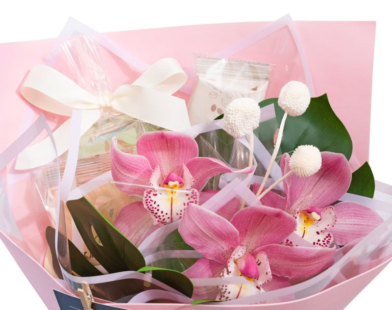 Букет, который станет приятным сюрпризом! Рядом с живыми цветами — душистый чай и бодрящий кофе, а к ним — десерт ручной работы.