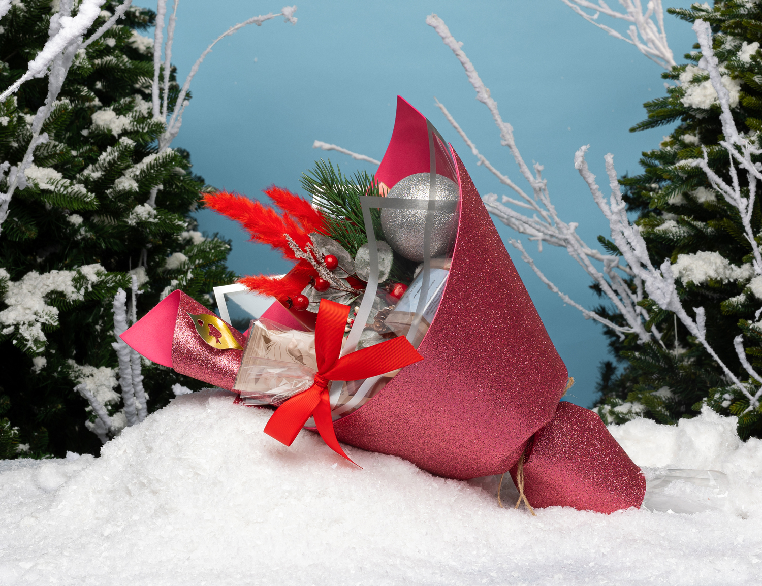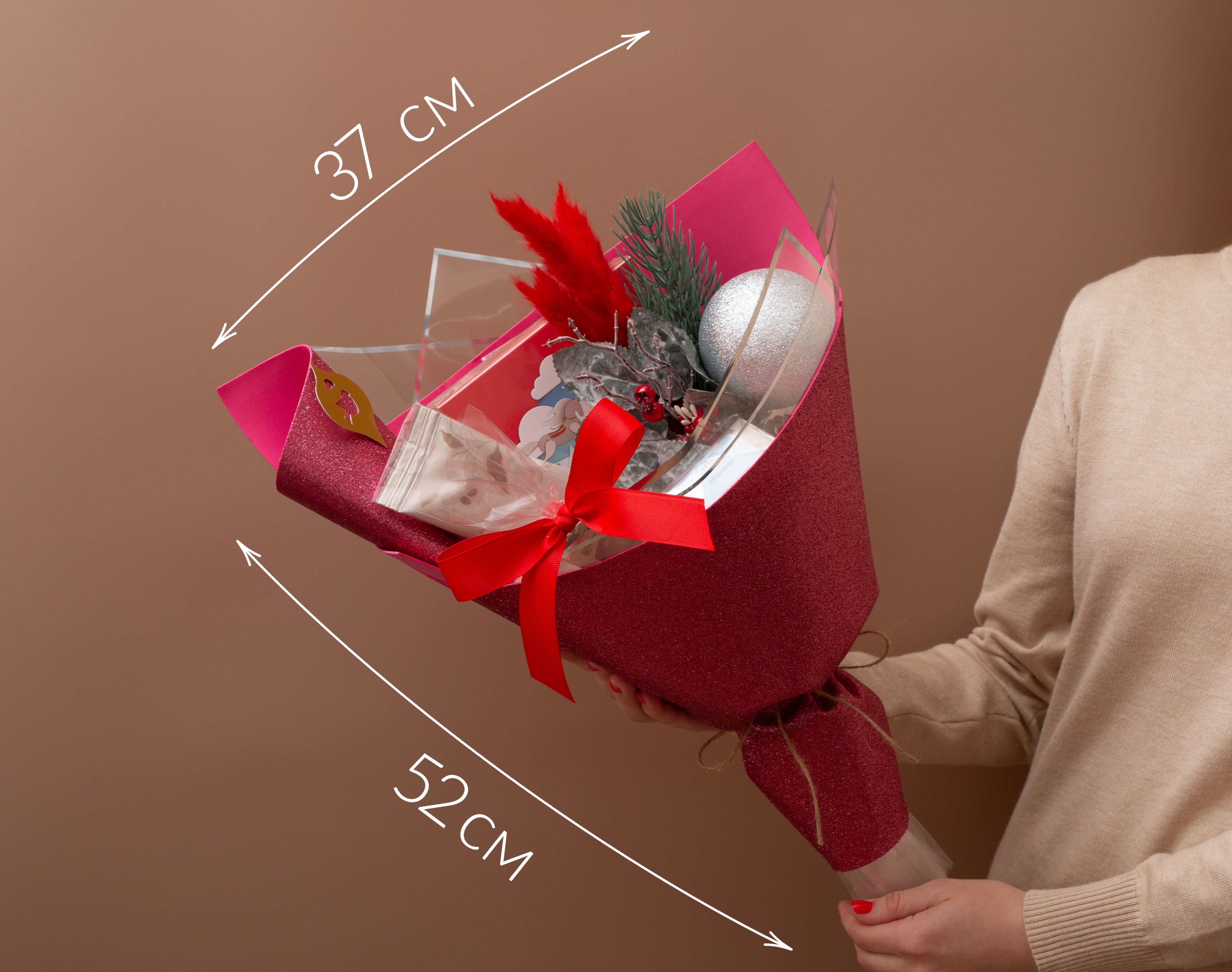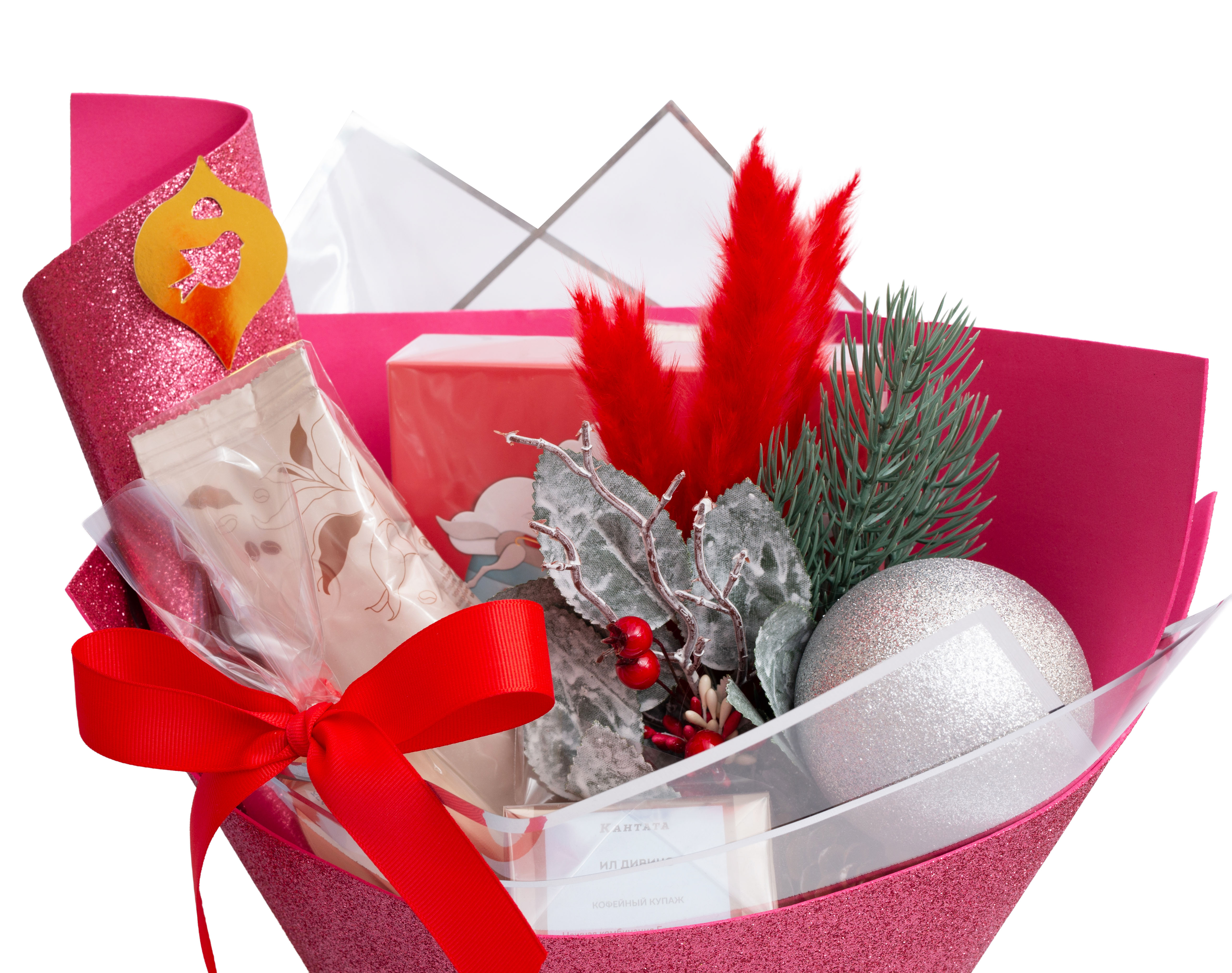 Яркий, выразительный подарок в насыщенных бордово-розовых тонах, наполненный теплом и энергией. В составе — кофейные бленды, шоколад и праздничный декор. Благодаря контрасту в оформлении букет выглядит эффектно и торжественно, создавая настроение праздника и уюта.