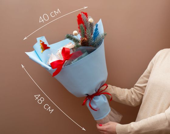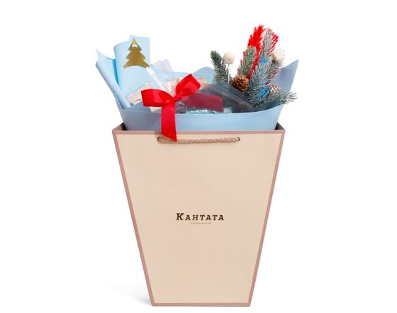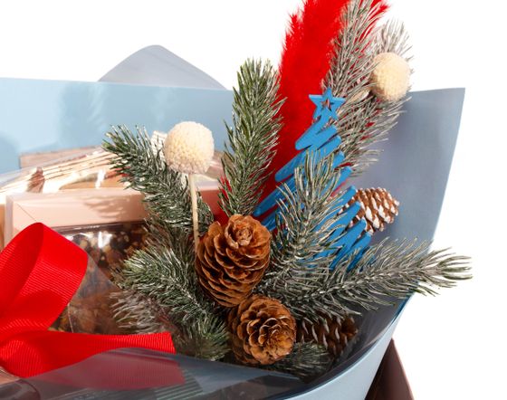 Изысканный зимний букет, в котором встречаются сладость шоколада и свежесть хвои. Внутри — шоколад, кофе и чай в гармоничном сочетании вкусов, дополненные мягким декором из хлопка и крафтовых элементов. Голубые тона упаковки напоминают морозное утро, а насыщенные ароматы делают этот подарок по-настоящему уютным и праздничным.