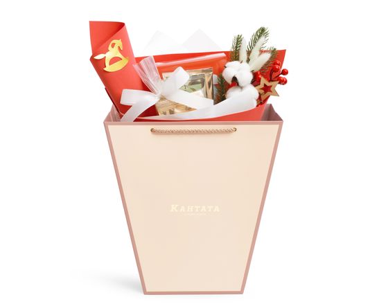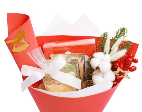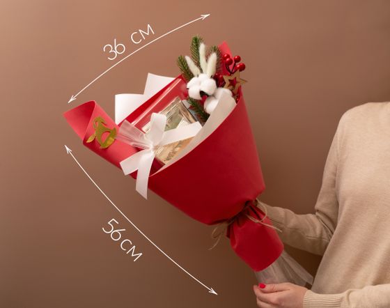 Теплый и атмосферный подарок, в котором сочетаются ароматные чаи, шоколад и зимние сладости. Оформление с еловой веточкой, хлопком и красной матовой пленкой создает ощущение домашнего уюта и праздника. Этот букет можно дарить как символ тепла и заботы — он одинаково уместен и для коллег, и для близких.