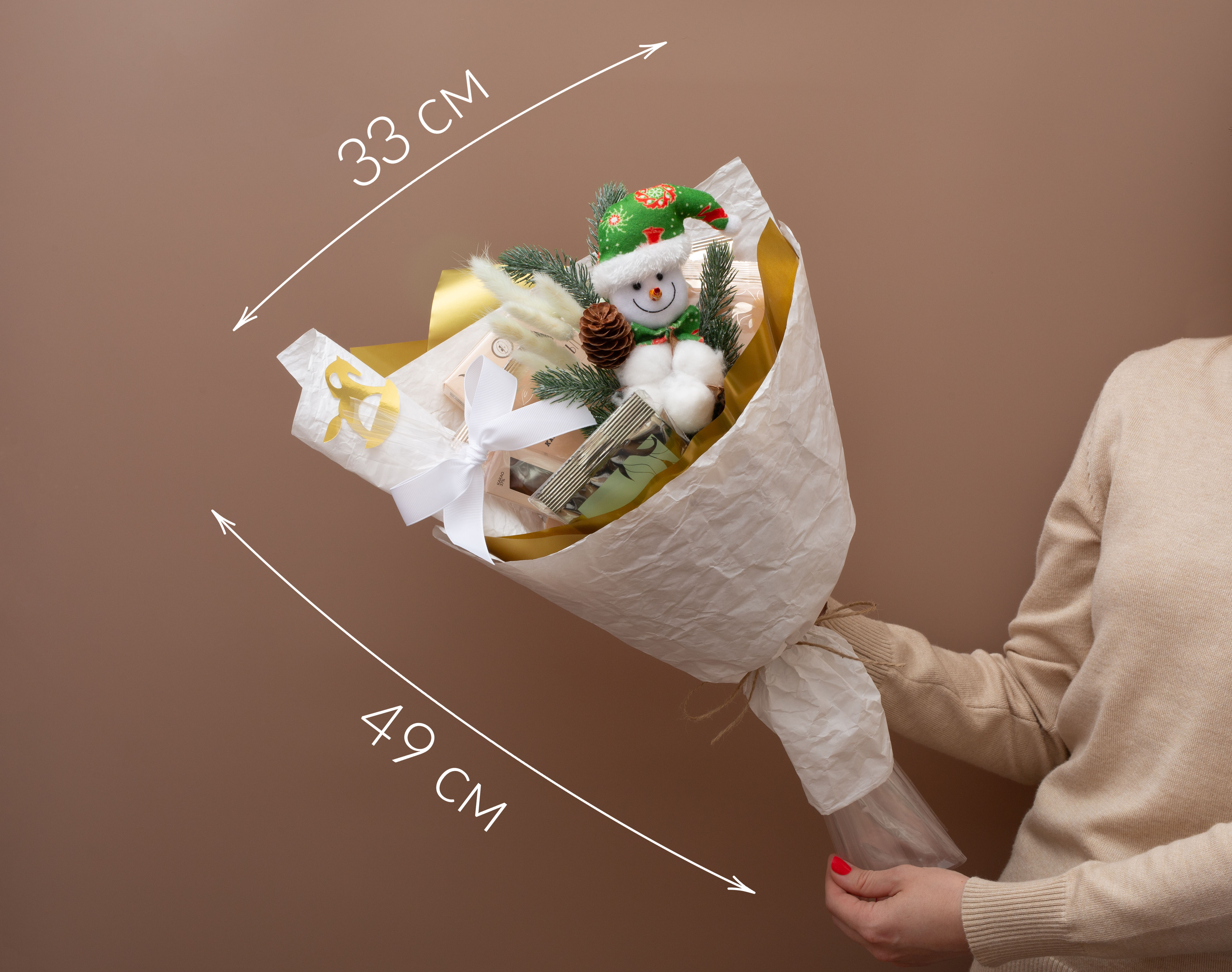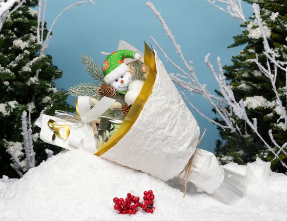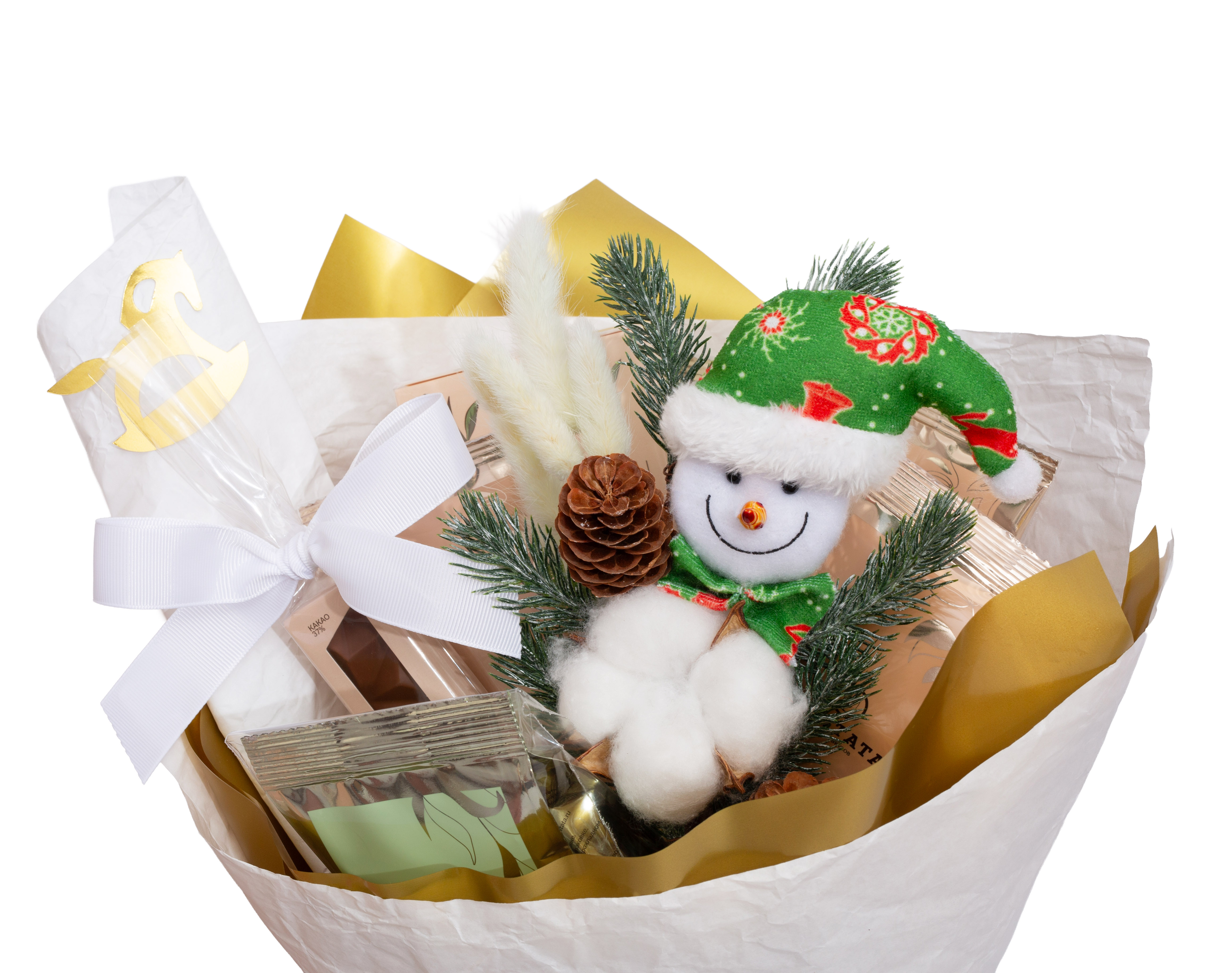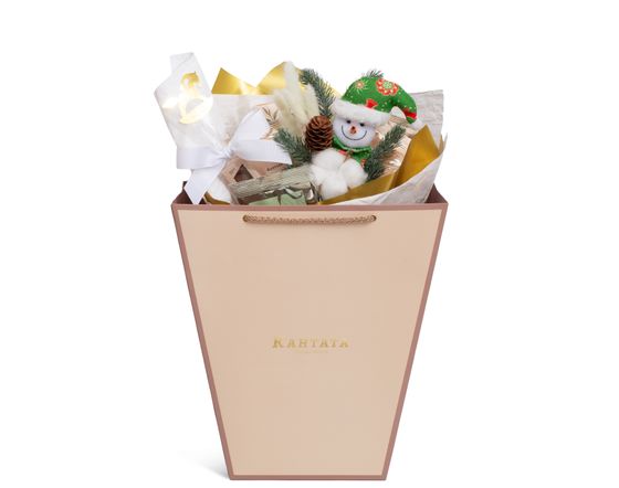 Праздничный и уютный букет в бело-золотом оформлении с новогодним снеговиком. Внутри — коллекция чая, шоколад, фильтр-пакеты для удобного заваривания. Этот подарок наполнен теплом, домашним уютом и ощущением зимнего волшебства.