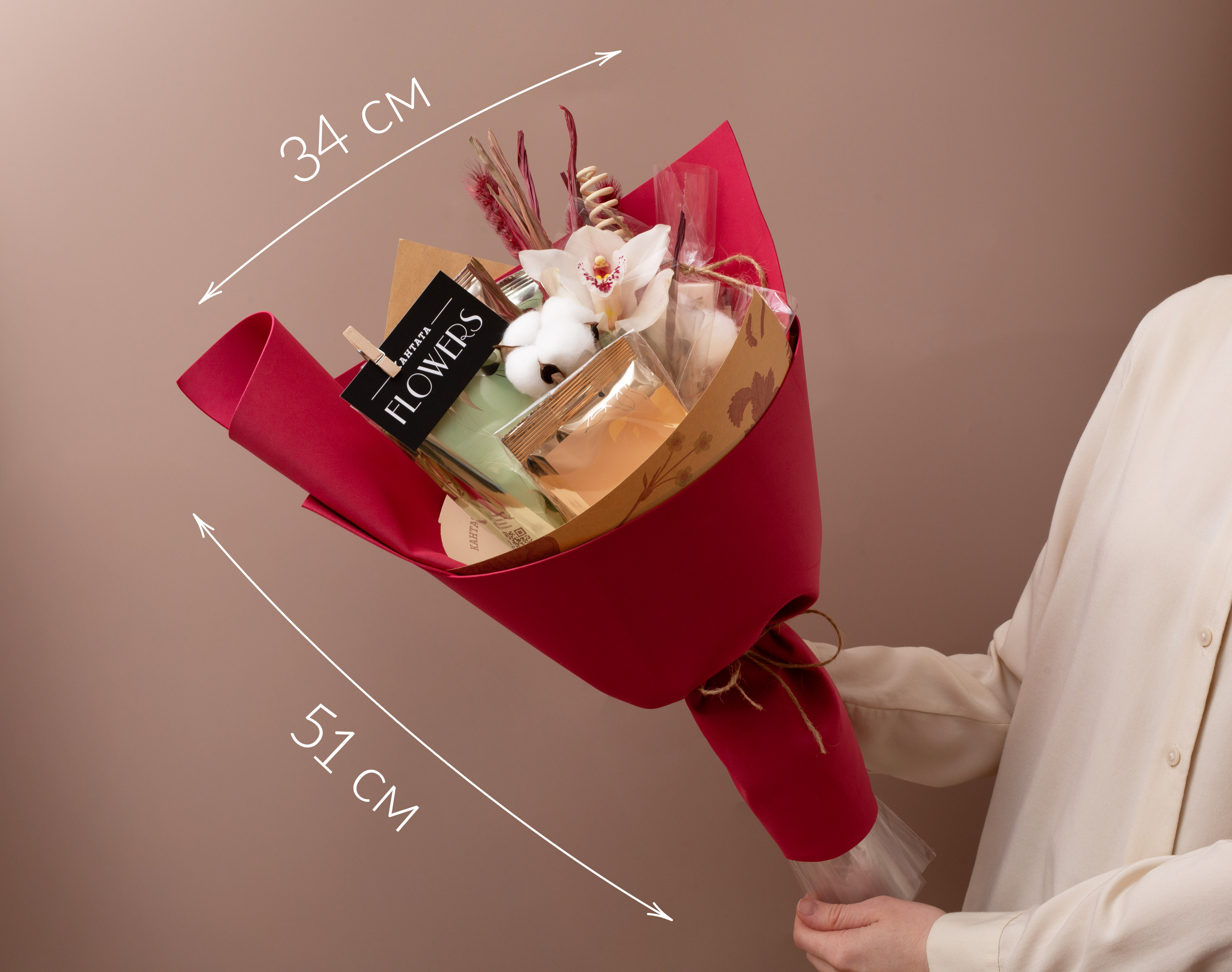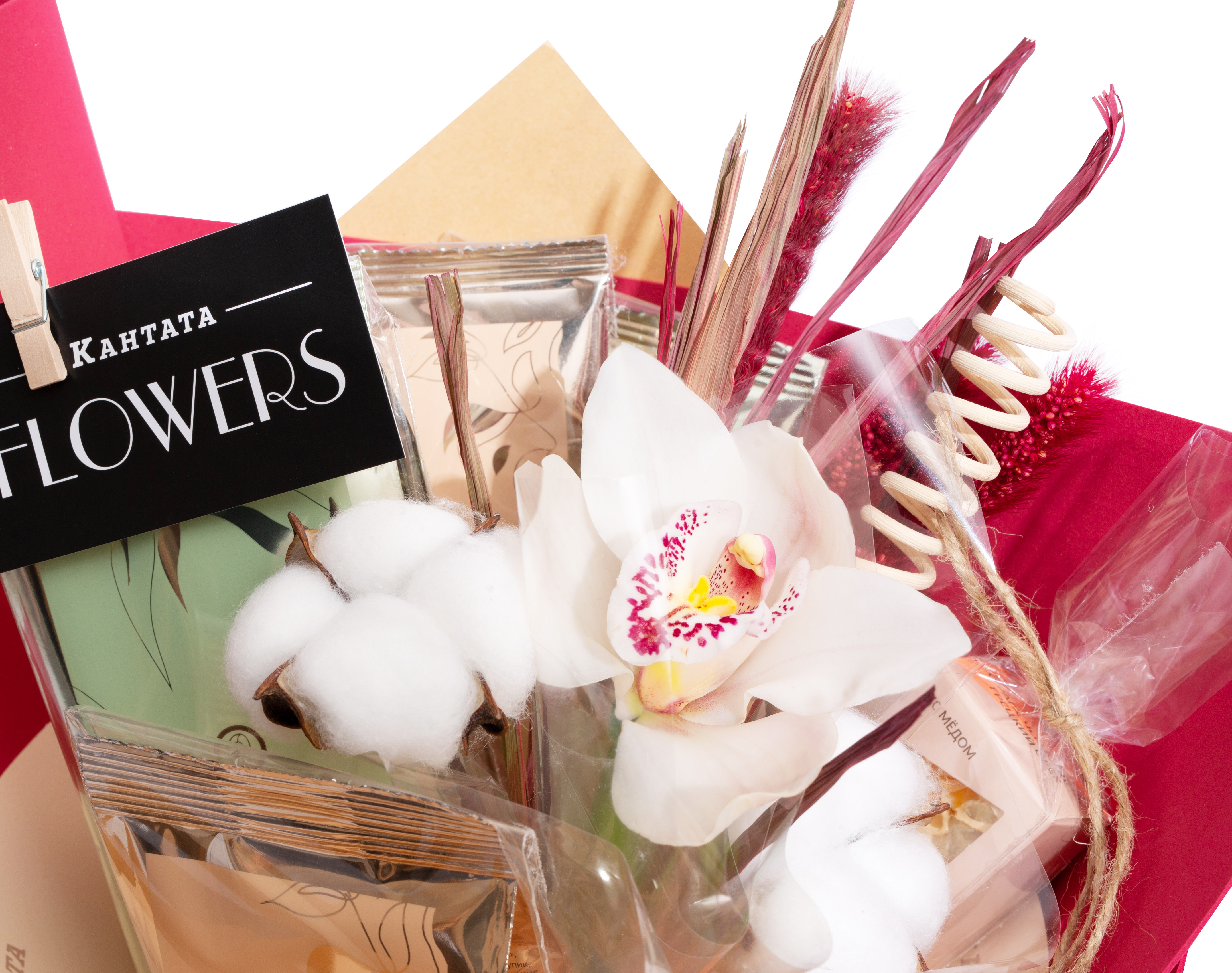 Как уютный плед в промозглый вечер. Цветочная композиция с орхидеей цимбидиум и хлопком дополнена сладостями и ароматным чаем с нотками фруктов и ягод. Тёплый, трогательный подарок, который будто создан для того, чтобы сказать: «Я рядом».