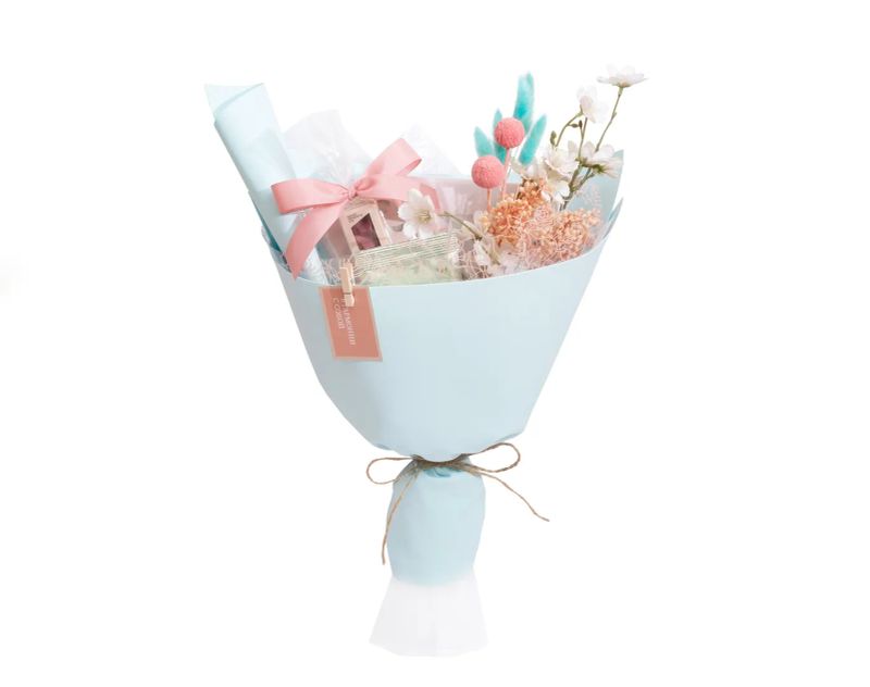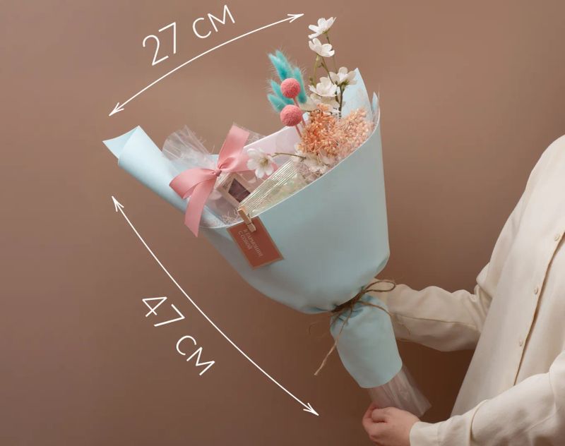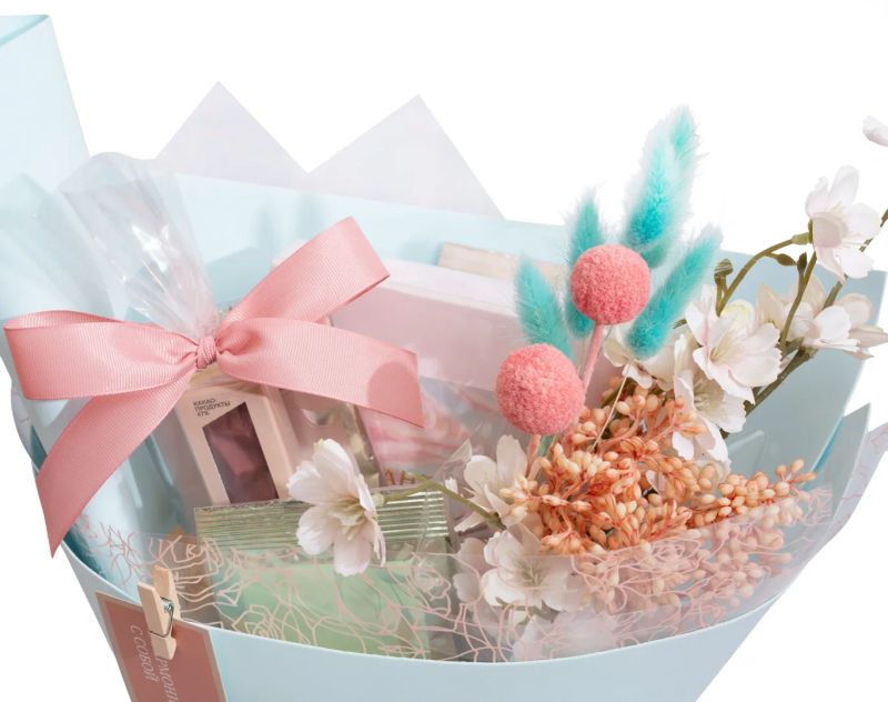 Букет с мягким, десертно-цветочным настроением. Черный чай с ягодными оттенками, ройбос с теплым характером и зеленые купажи с растительными нотами создают спокойную и уютную чайную основу. Кофе с насыщенным вкусом и шоколад с выразительным характером добавляют глубину, а воздушная флористическая композиция с цветами сливы, ягодными ветвями и пастельной упаковкой усиливает ощущение легкости и тепла, словно тихое весеннее небо над головой.