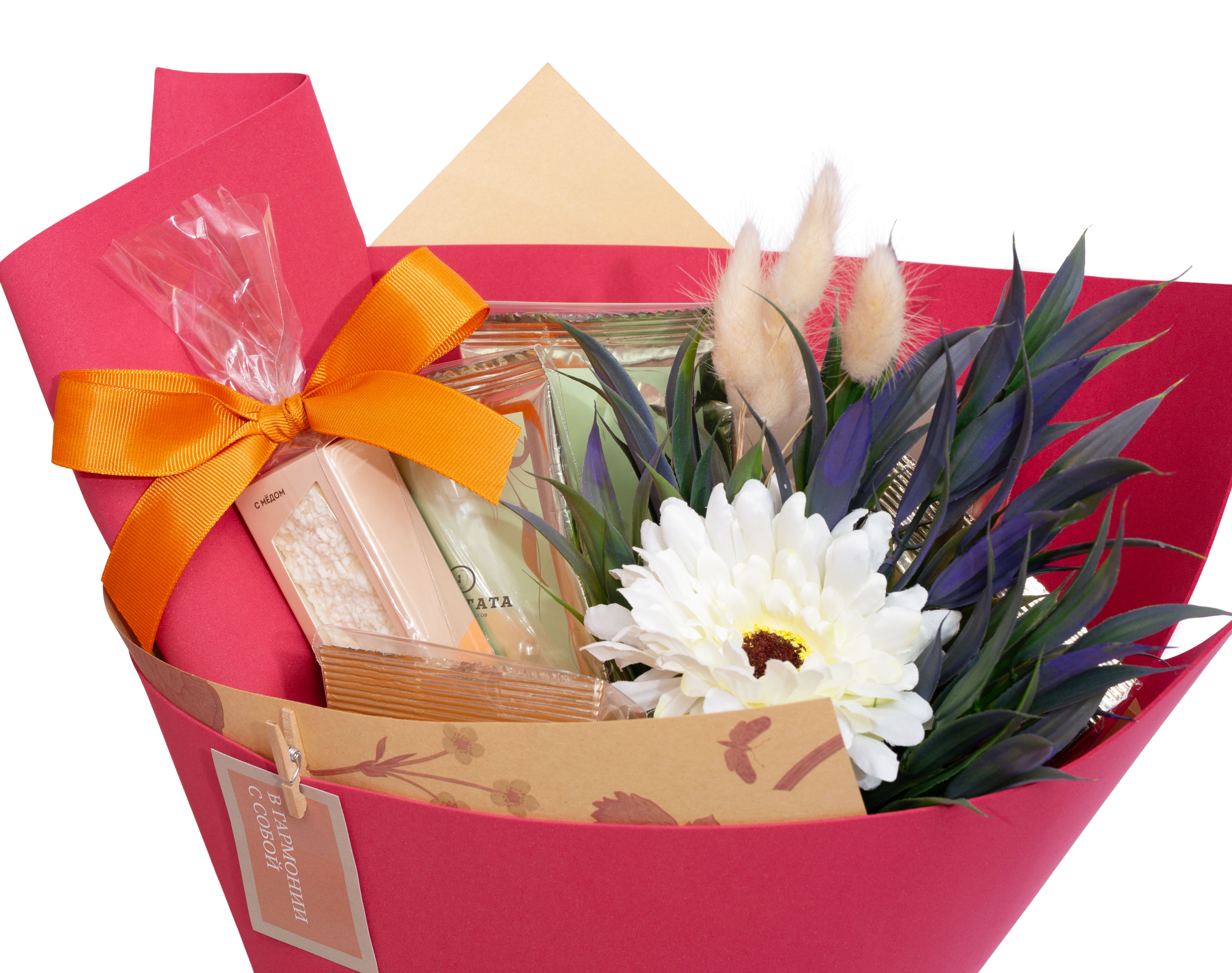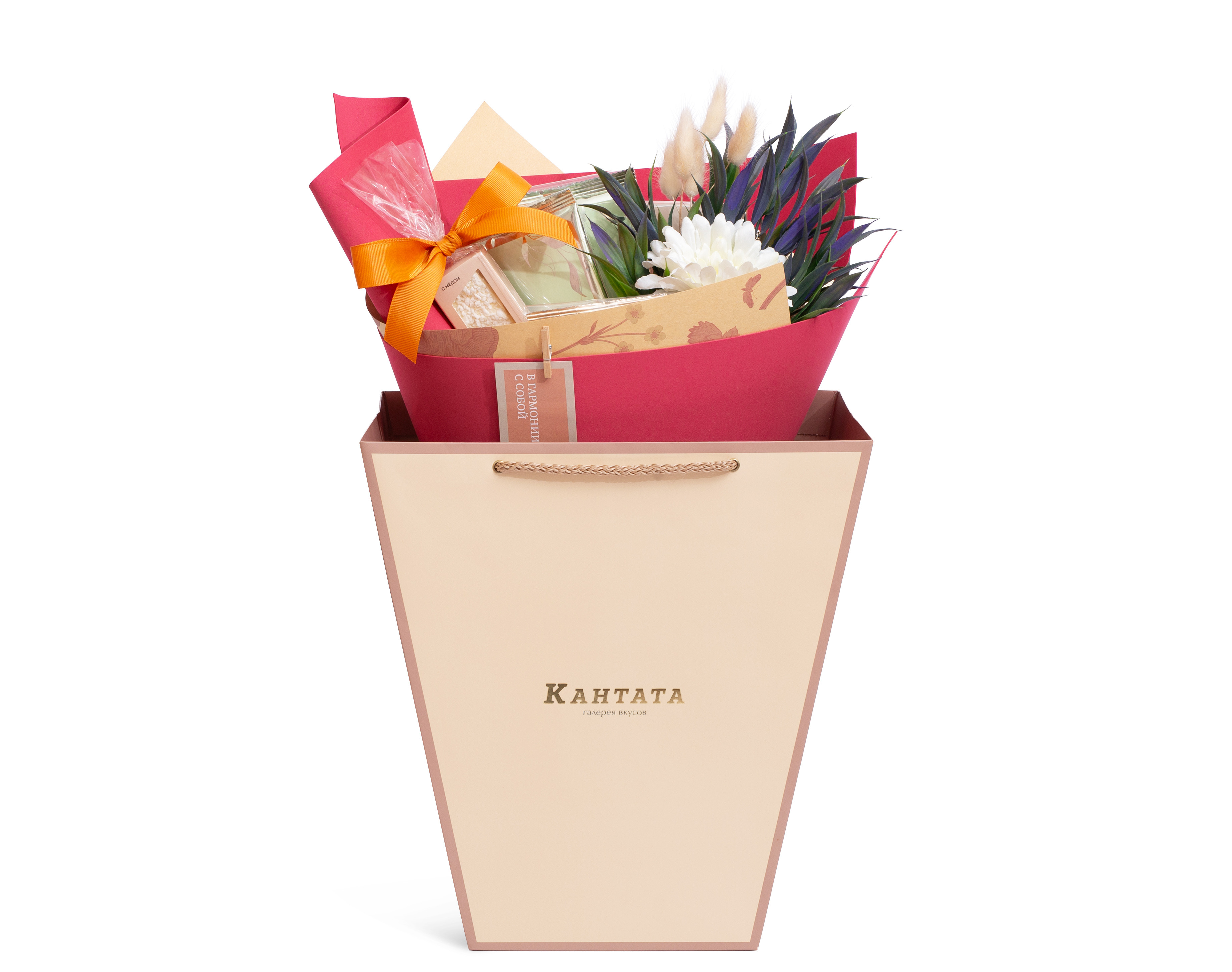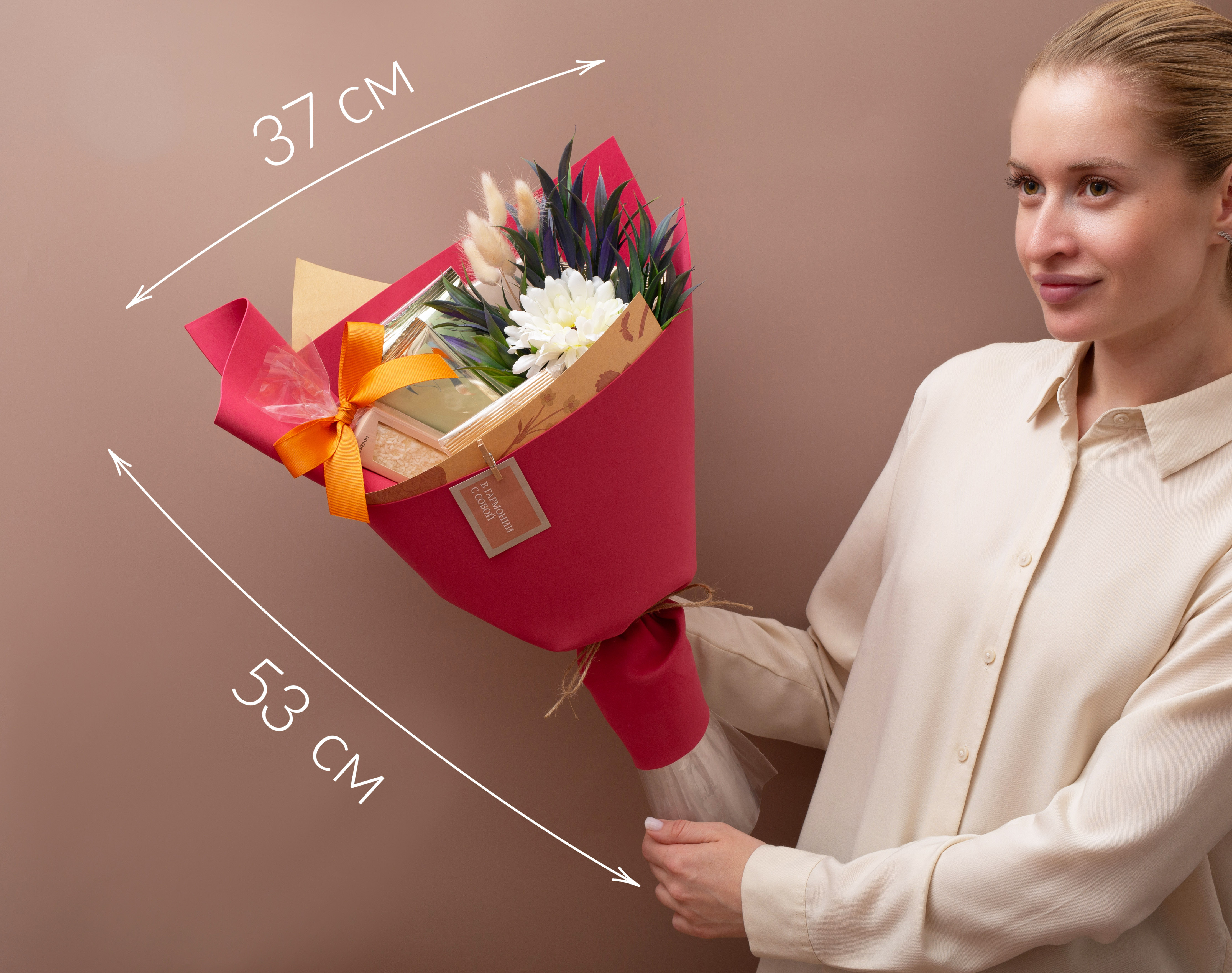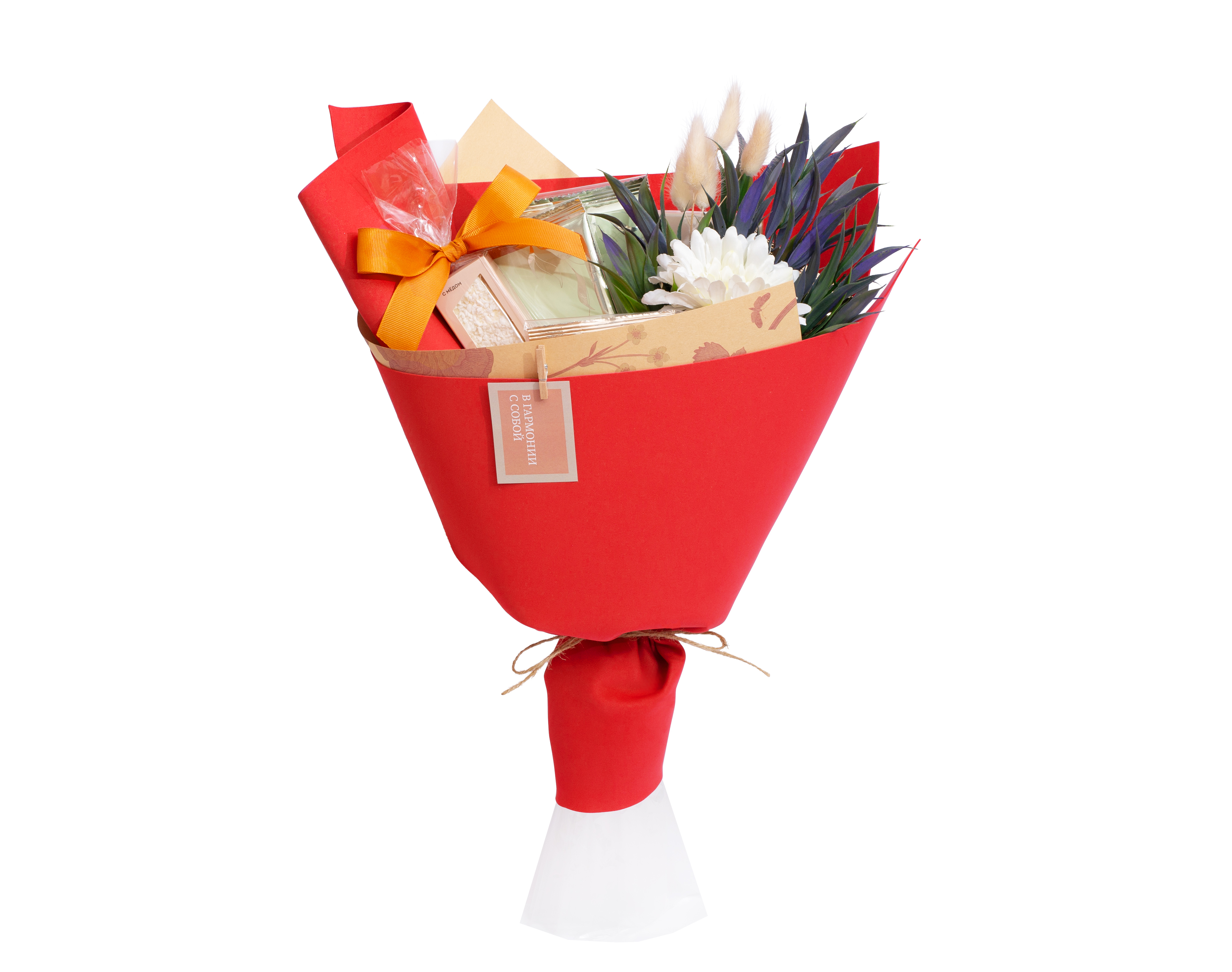 Букет в насыщенно-красной палитре с мягкой ноткой лесных орехов и сливочного крема. Внутри — густой ирландский кофе, чай шоколад с вишней, зелёный чай с ванилью, чёрный с карамельной дымкой и травяной с лёгкой кислинкой. Декор: гербера, зелёная ветка, лавандовый лагурус. Букет словно из старого альбома с поездки по зелёным холмам.