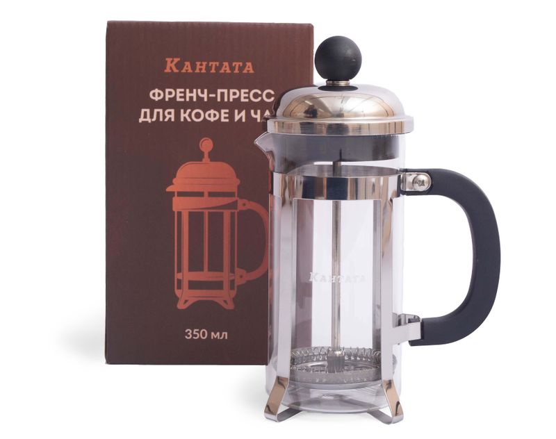 Этот френч-пресс произведен в Китае специально для Кантаты. Он изготовлен из жаропрочного боросиликатного стекла и нержавеющей стали, имеет стильный и современный дизайн. Ножки придают френч-прессу устойчивость.