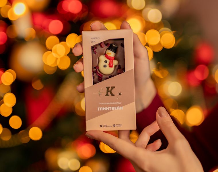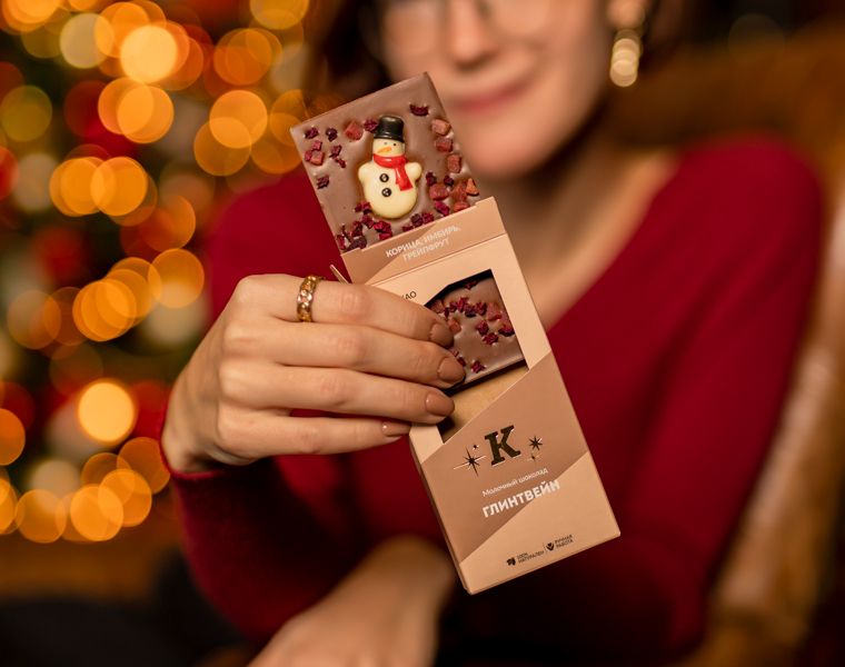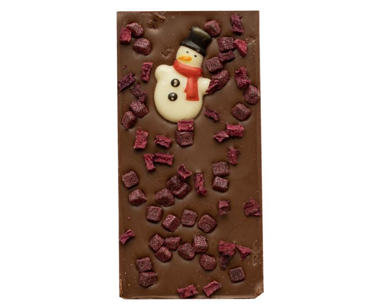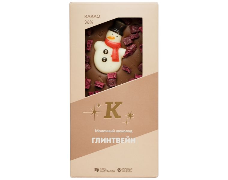 В нежность молочного шоколада тонкими нотами вплетена корица, имбирь, кусочки сочного грейпфрутового желе и сублимированной свеклы, чтобы в полной мере воссоздать вкус и атмосферу праздничных вечеров. Плитка украшена снеговичком из белого шоколада и сверкающим бордовым «перламутром» для поддержания особого зимнего настроения.