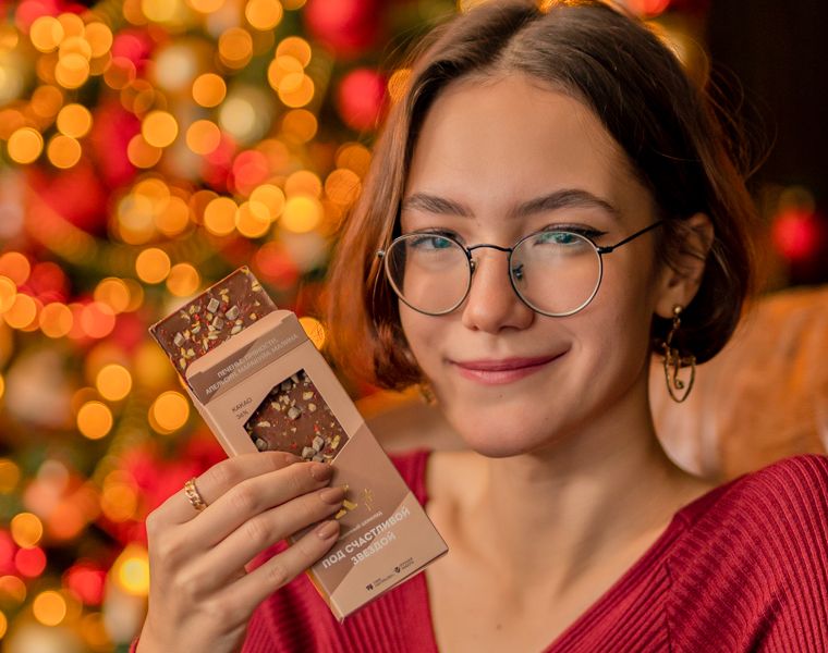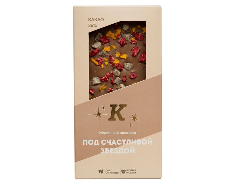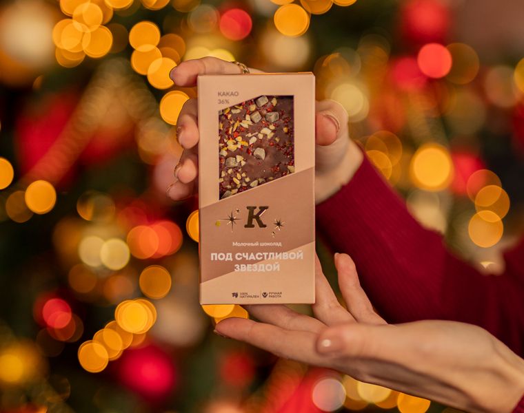 Молочный шоколад с ароматным печеньем, сочными кусочками апельсинового желе, кранчем клубники и маракуйи и согревающими пряностями. Создаст праздничное настроение и порадует в морозную погоду.