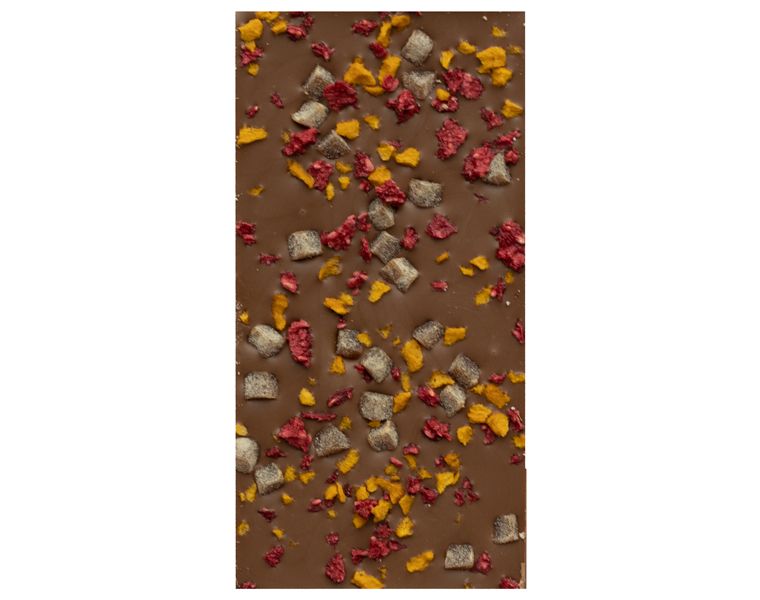 Яркие ароматы пряностей этой плитки покорят до начала дегустации. В основную канву вкуса молочного шоколада, имбиря и печенья вплетены сочные ноты ягод и фруктов, которые дарят насыщенную кислинку! В послевкусии они останутся долгой согревающей сладостью.
