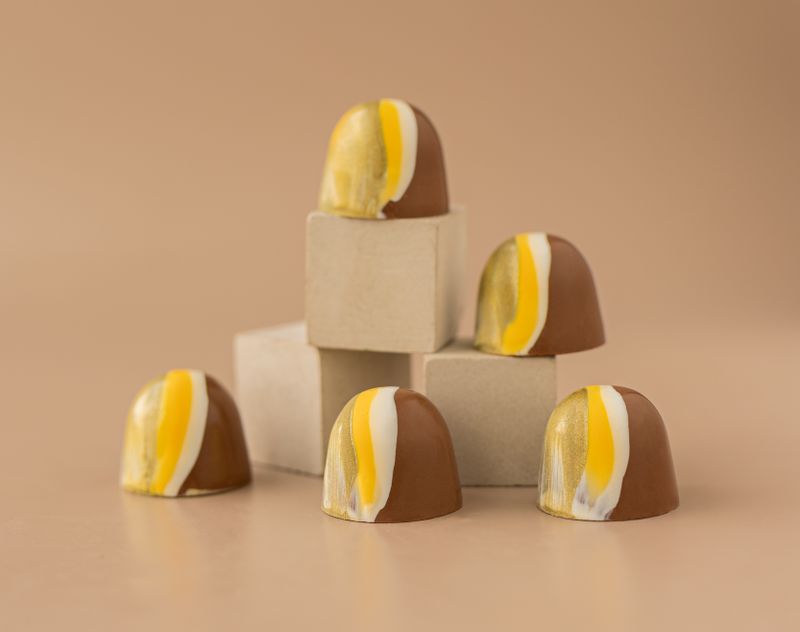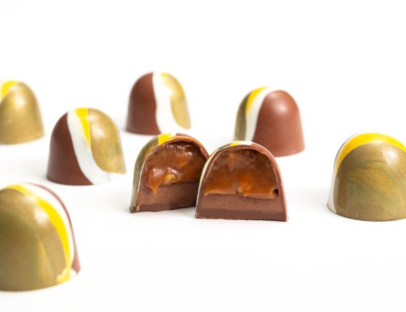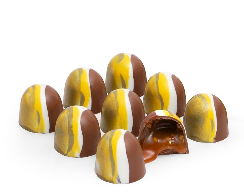 Корпус из молочного шоколада — это классическая форма. Его гармоничный вкус легок для понимания, он притягивает своей простотой и изяществом. Начинка — это подтекст. Солоноватая сливочная карамель, ореховая паста из фундука, дробленый арахис и вафельная крошка наполняют «шоколадную» поэзию кокетливыми и сладкими смыслами.