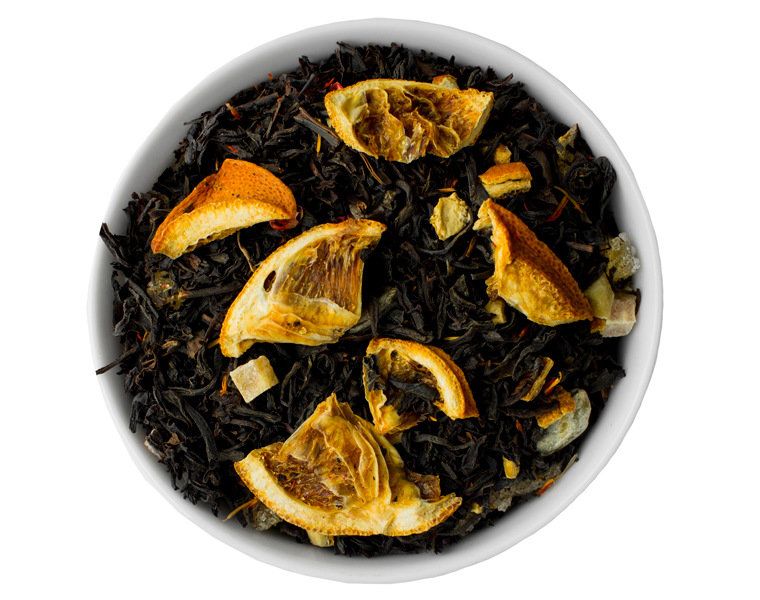 Состав: черный чай, цедра апельсина, цукаты имбиря, ароматизатор, цукаты папайи, кусочки апельсина, фисташка, розовый перец, сафлор.