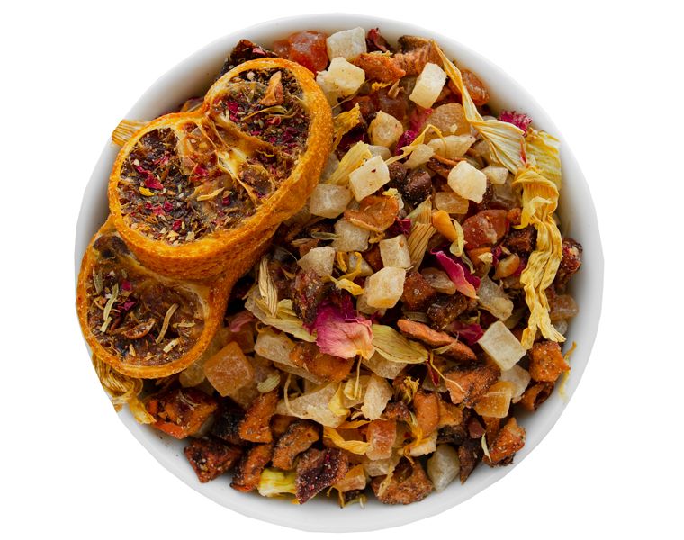Сочный купаж «Лето на Гавайях» состоит из солнечных тропических фруктов — папайи, манго, мандарина, яблока и ананаса. В этой фруктовой смеси чая нет совсем.
