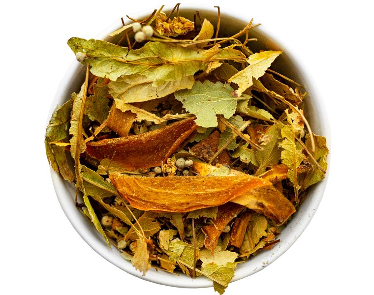 Травяная смесь с сушеной хурмой, липой, корицей и лепестками сафлора. Купаж раскрывается пряной сладостью, напоминая древний русский напиток — сбитень.