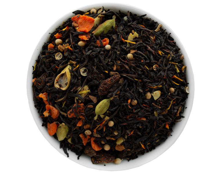Состав: черный чай, морковь, изюм, ароматизатор, корица, кориандр, миндаль, кардамон, цветы сафлора.