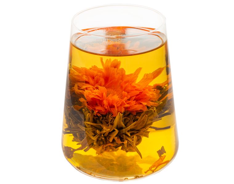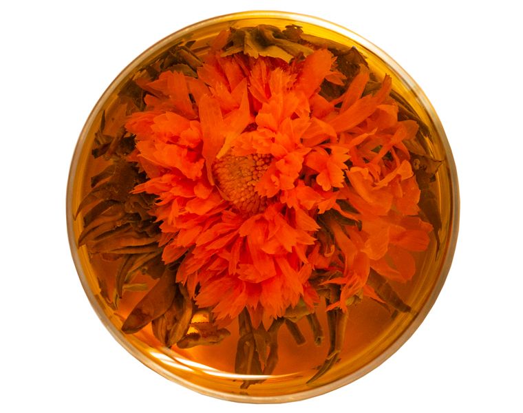 Связанный чай «Сочный персик» — это красивые ровные шарики, цветом от серебряного до светло-зеленого. Опустите один шарик этого чая в стеклянный чайник с водой. За первые несколько минут тонкими жемчужинами на поверхность поднимутся оставшиеся в листочках пузырьки воздуха, вскоре бутон начнет распускаться — из глубины чайного «букета» появится яркий цветок желтой календулы.