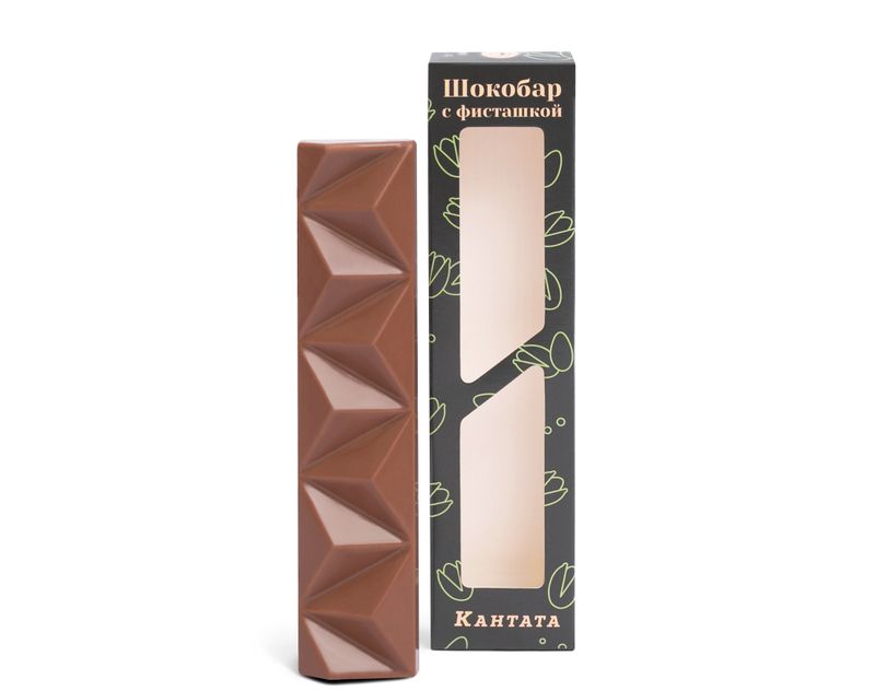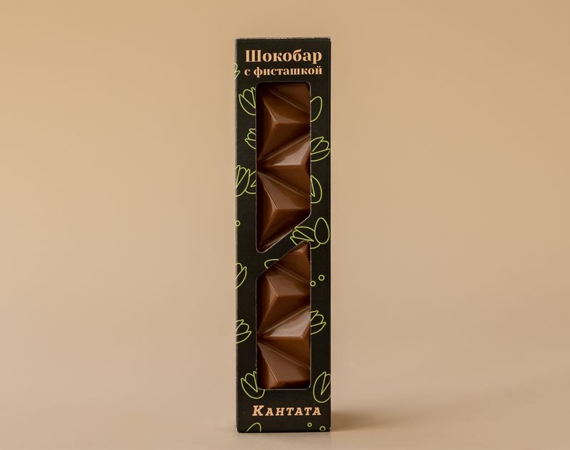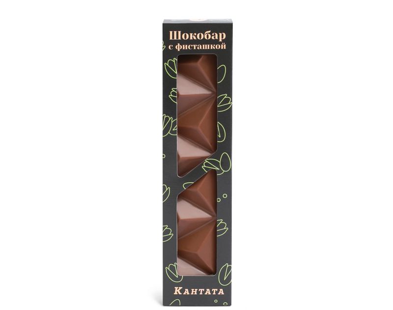 Небольшая плитка молочного шоколада, разделённая для удобства на маленькие треугольники. Внутри десерта изысканная начинка из пасты фундука и дробленой фисташки.