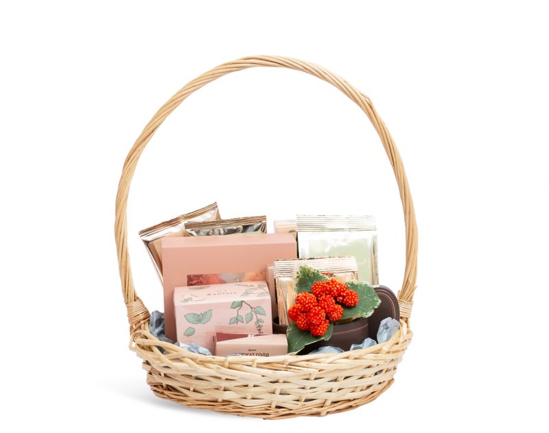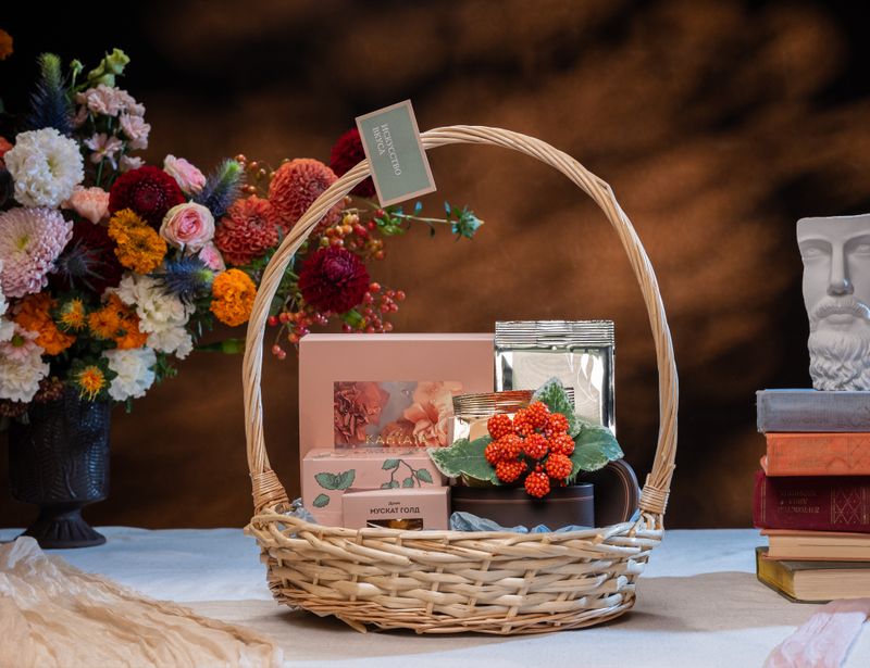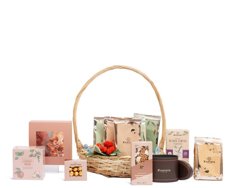 Корзина, наполненная вкусами лета и нотками уюта. Чай с мятой и апельсином, десерты от кондитеров Кантаты, щепотка золота в виде драже — каждый элемент создаёт атмосферу неспешного наслаждения. Прекрасный выбор для душевного подарка или личного гастрономического ритуала.