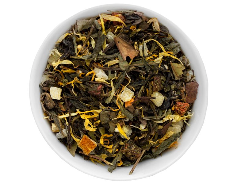 Состав: купаж индийского и китайского белого чая, ананас, натуральный ароматизатор, яблоко, цедра лимона, марокканская мята, киноа, календула, дыня Гала.