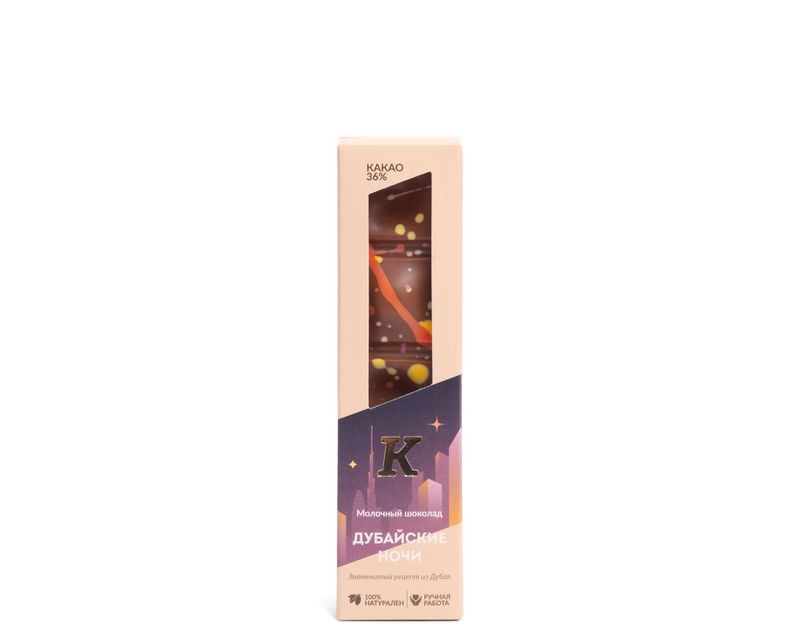 Вдохновившись роскошью и кулинарными изысками Дубая, шоколадная фабрика создала свое прочтение дубайского шоколада, которое не только сохранило узнаваемые черты восточного десерта, но и привнесло мелодию творчества.