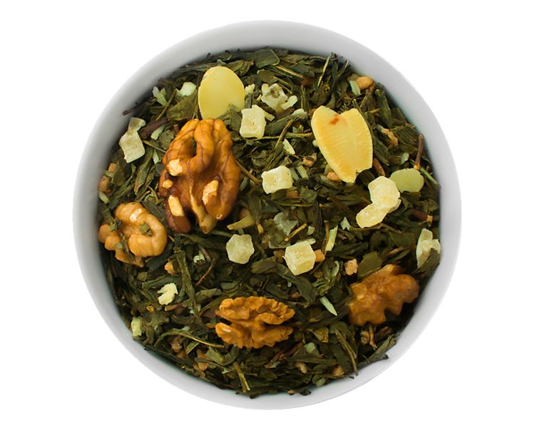 Состав: китайский зелёный чай Сенча, засахаренный фундук, грецкий орех, миндальные хлопья, цукаты ананаса и кокосовые чипсы, ароматизатор.