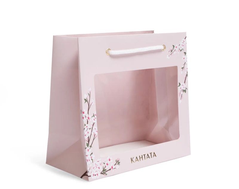 Стильная сумка с окошком для ваших подарков. Размер — 18x17x9см.