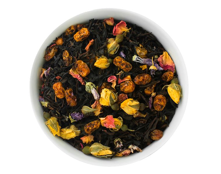 Купаж чёрного чая с ягодами облепихи, бутонами розы и мальвой. Напиток обладает приятным насыщенным вкусом, отлично сочетается с молоком и медом.