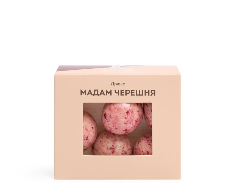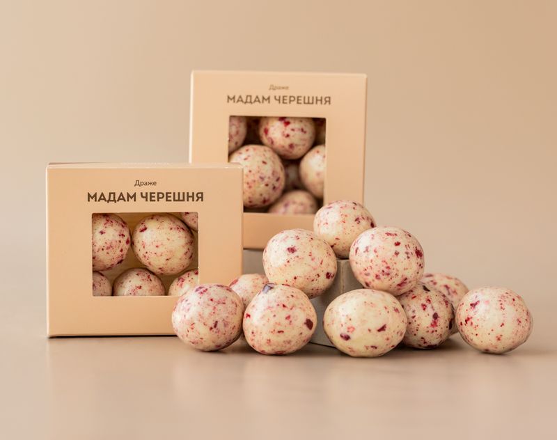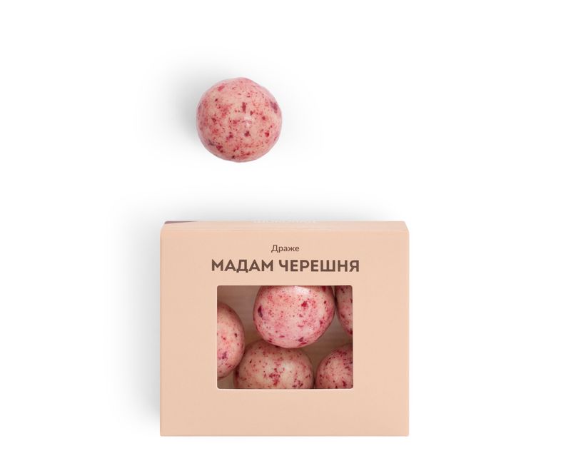Драже «Мадам Черешня» состоит из черешни и нескольких слоёв нежного молочного и белого шоколада.
