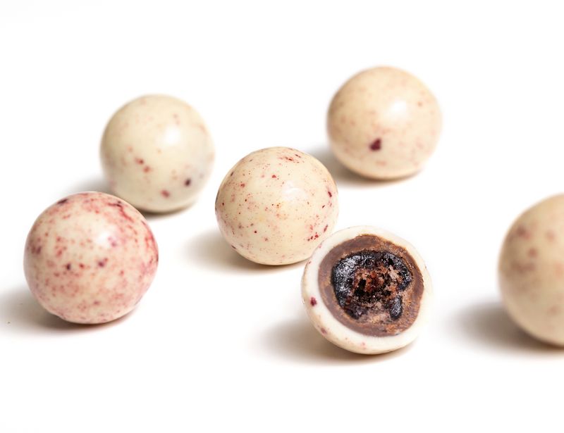 Итальянская черешня, согретая лучами жаркого южного солнца, особенно сочная. Для драже отбираются самые сладкие ягоды, которые сначала покрываются молочным шоколадом, а затем белым. На последнем этапе в шоколад добавляют измельченную сублимированную вишню, которая создает яркий мозаичный рисунок.