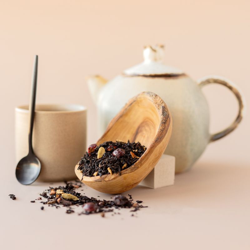 Купаж чёрного чая с пряностями и черникой. Ягодный аромат напитка с пикантными нотками поможет в укреплении иммунитета.