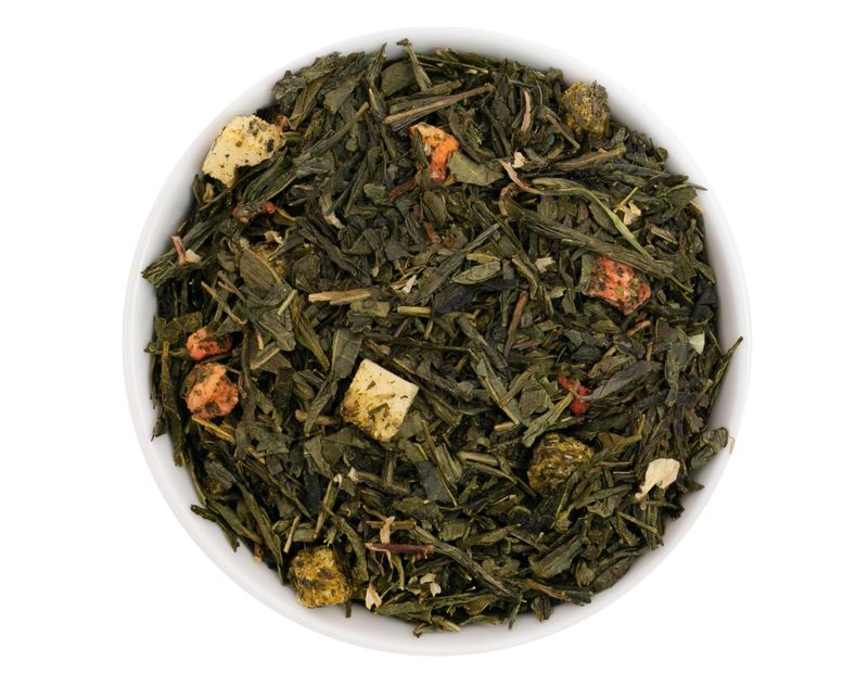 Этот купаж приготовлен на основе китайского зеленого чая сенча с клубникой и киви. Вкус чая мягкий, с легкими фруктово-ягодными нотами и нежным цветочным послевкусием.