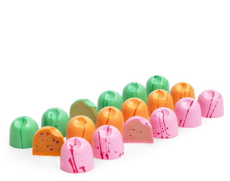 Конфеты розового цвета изготовлены из белого шоколада и перетертого миндаля, имеют сладкий ягодный вкус. Впечатляют клубничными искрами в начинке.
