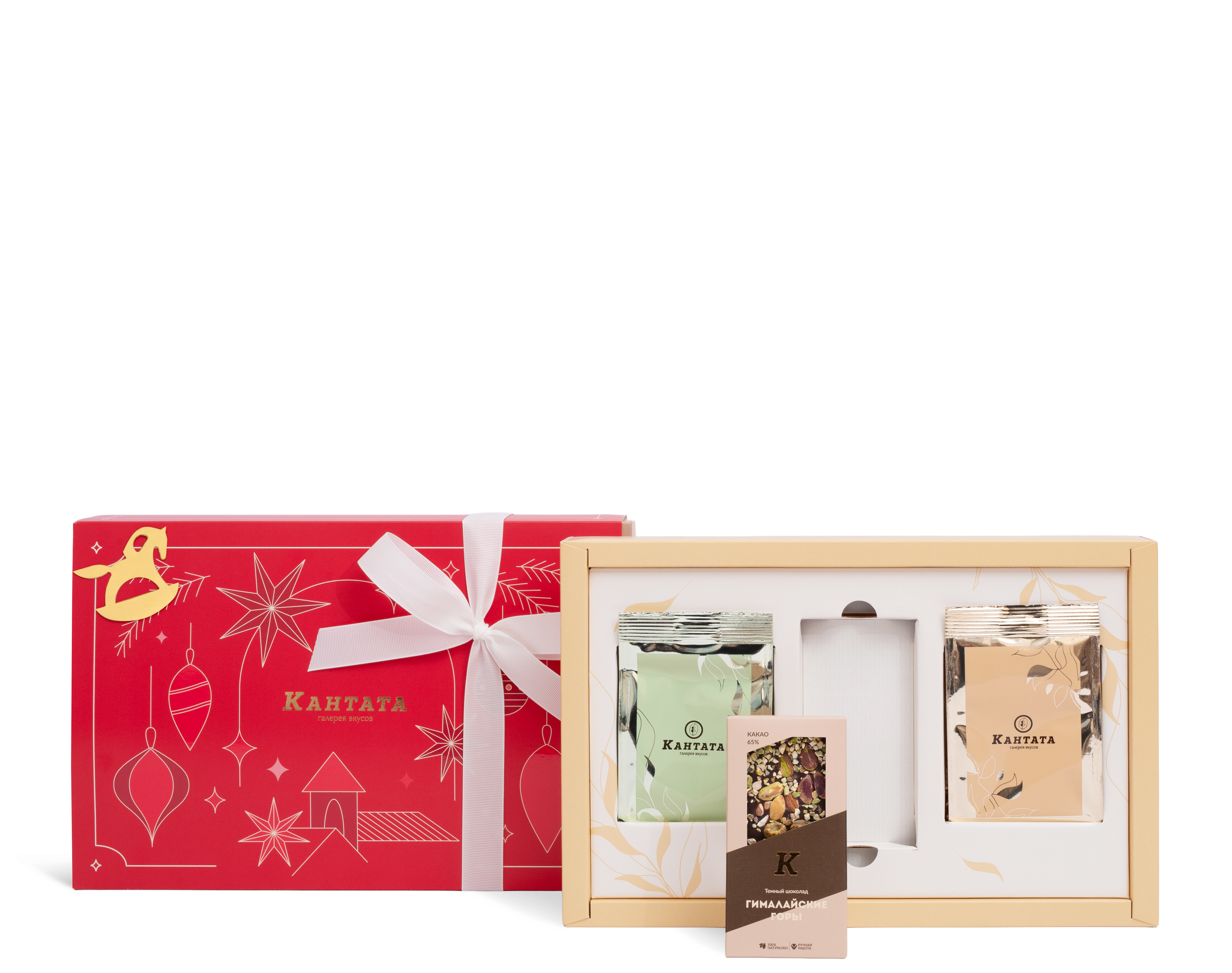 Для тех, кто любит открывать новые вкусы. В наборе — два вида чая и плитка темного шоколада, которые создают идеальное сопровождение для зимнего вечера. Удобная коробка с ложементом делает этот набор практичным и стильным решением для подарка.
