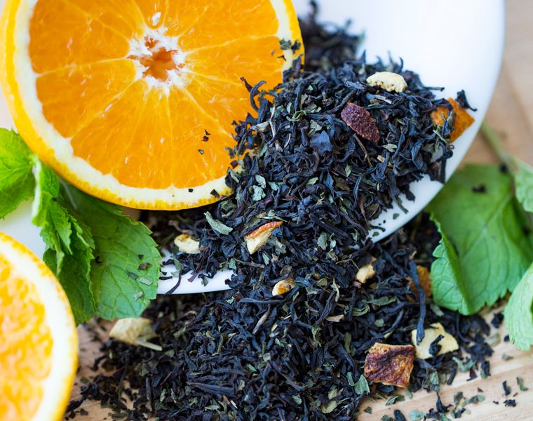 Чёрный чай с цедрой апельсина и перечной мятой. Сладкий холодок перечной мяты и сочная свежесть апельсина создают харизматичный дуэт для поддержания здоровья организма.