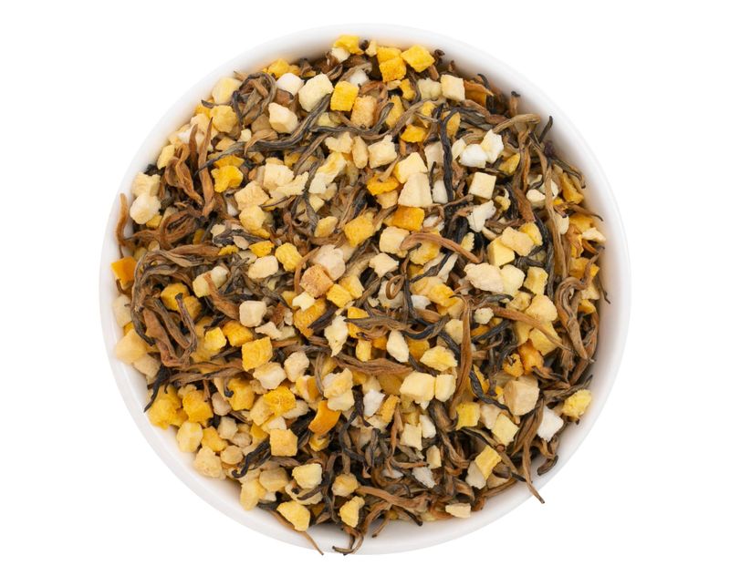 Классический юньнаньский черный чай дяньхун, основа купажа, обладает мягким насыщенным вкусом с нотами меда и сушеного персика, а сладкие фрукты добавляют объема и делают чашку чая по-летнему солнечной.