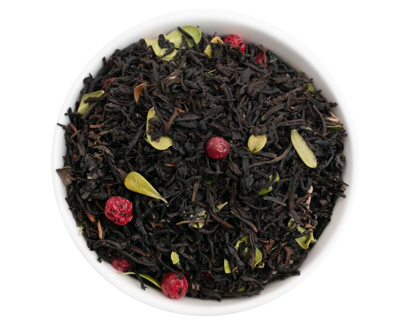 Нарядный черный чай дополнен ягодами красной смородины и листиками брусники. Ягодный вкус и приятный аромат напомнят о любимой с детства леденцовой карамели.