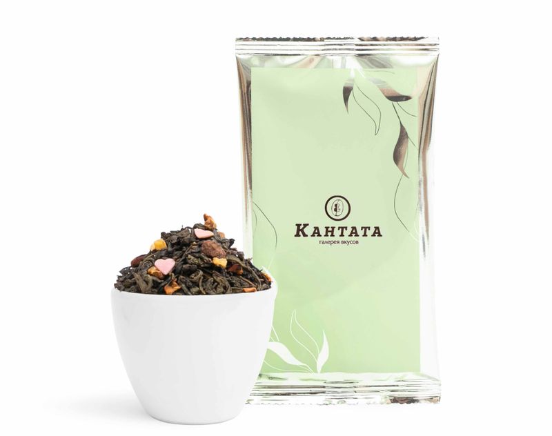 Зеленый чай с ароматом яблочно-лимонного чизкейка. Украшен сахарными розовыми сердечками. Обладает воздушным сливочным вкусом.