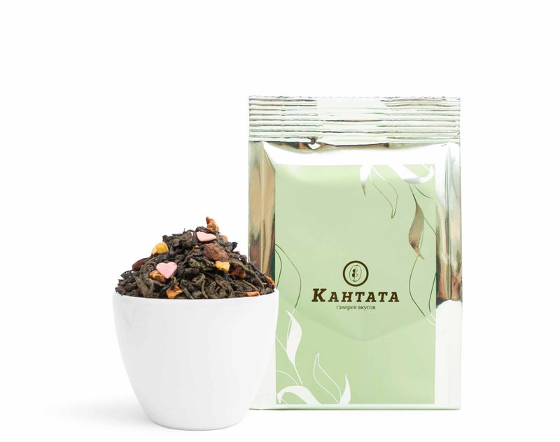 Состав: зелёный чай, кусочки яблока, ароматизатор, корица, сахарные сердечки, кусочки лимона.