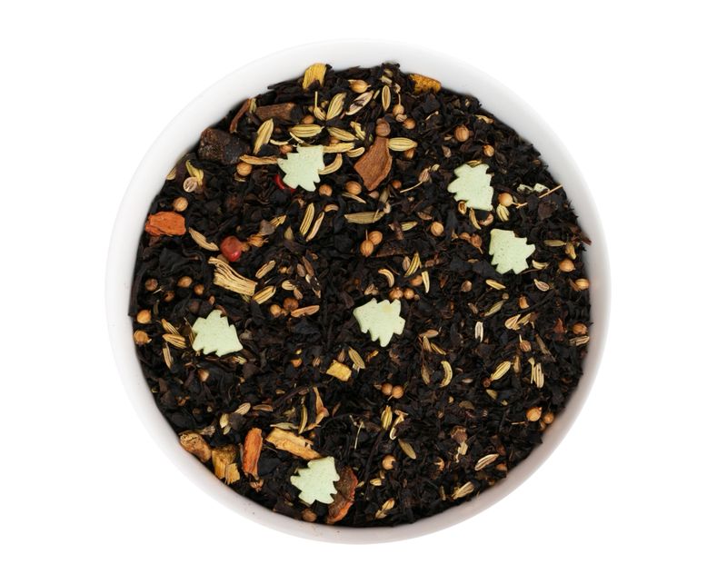 Состав: черный чай, фенхель, кориандр, корень лакрицы, сахарные ёлочки (картофельный крахмал, пищевой краситель - концентрат спирулины и сафлора), ароматизатор, корица, семена аниса, кусочки сливы, розовый перец, красная смородина.
